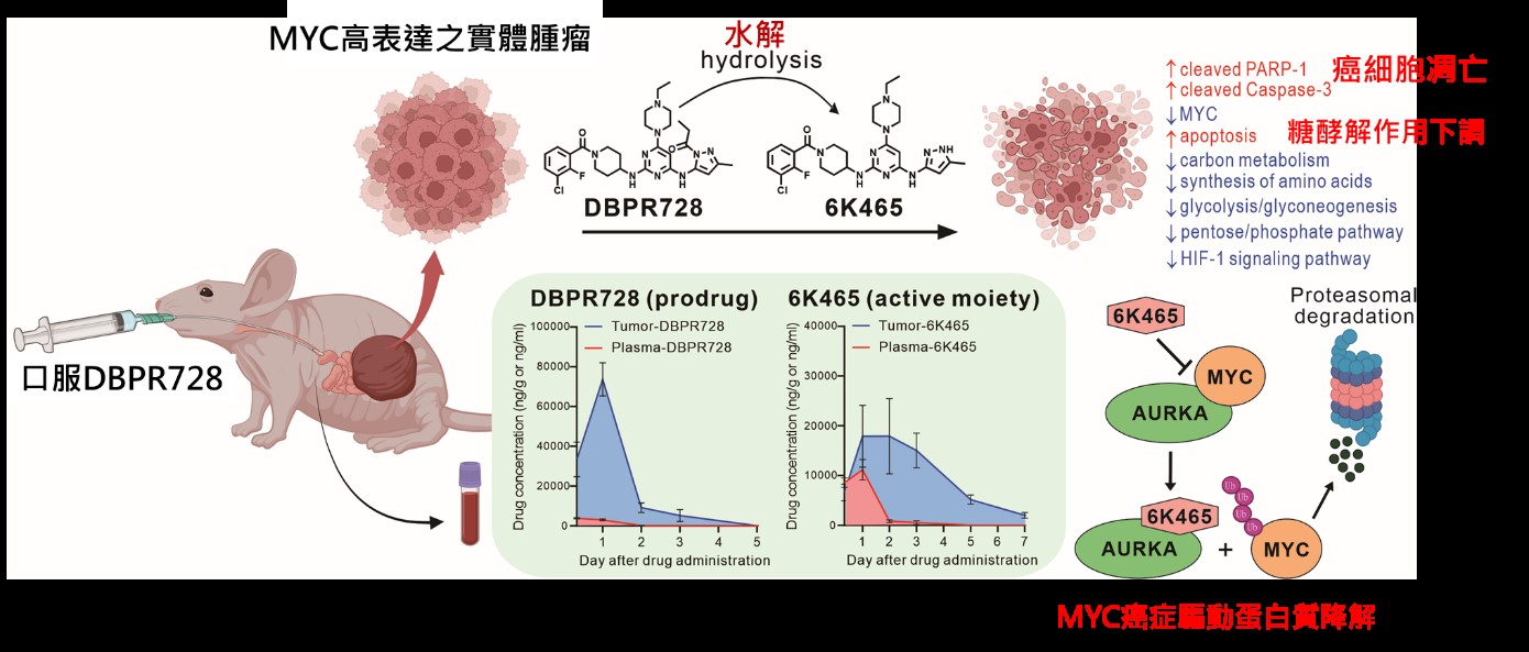 國衛院的DBPR728候選發展藥物因特殊的前體藥物(prodrug)設計,從口服途徑經過腸胃道到達腫瘤的藥物濃度本身就比其他類似小分子高出許多,並且可以在腫瘤逐漸釋放出活性藥物,維持在腫瘤的有效濃度以及生體利用率,促使腫瘤消退。在多種具MYC基因擴增或高表達的異種移植腫瘤小鼠動物模式,如小細胞肺癌、三陰性乳癌、肝癌、髓母細胞瘤等,皆證實可以造成腫瘤消退,部分異種移植腫瘤在停藥後3個月內甚至未發現復發跡象。