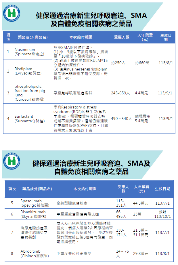 為滿足SMA病友的期待,放寬含nusinersen成分之脊髓腔內注射藥物及含risdiplam成分之口服液劑之給付條件:(1)原「3歲以下發病確診」擴增至「18歲以下發病確診」。(2)取消上肢運動功能RULM≥15分起始治療條件。(3)使用nusinersen或risdiplam藥品後出現嚴重不耐受反應,得轉換一次。本次擴增給付廠商同意降價,預估每人每年藥費約660萬元,約250名病人受惠,藥費新增19億元。