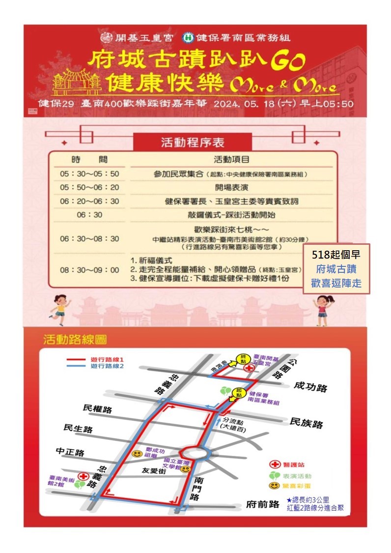 為歡慶健保29週年,並欣逢臺南建城400年,中央健康保險署(以下簡稱健保署)南區業務組與臺南開基玉皇宮於5月18日(星期六)共同舉辦 「府城古蹟趴趴go 健康快樂more & more 」踩街活動,邀請民眾呼朋引伴報名參加,希望透過休閒踩街走訪府城古蹟,體驗台南文化古都之美,同時也可向玉皇宮祈求平安與福運,健康快樂一整年。