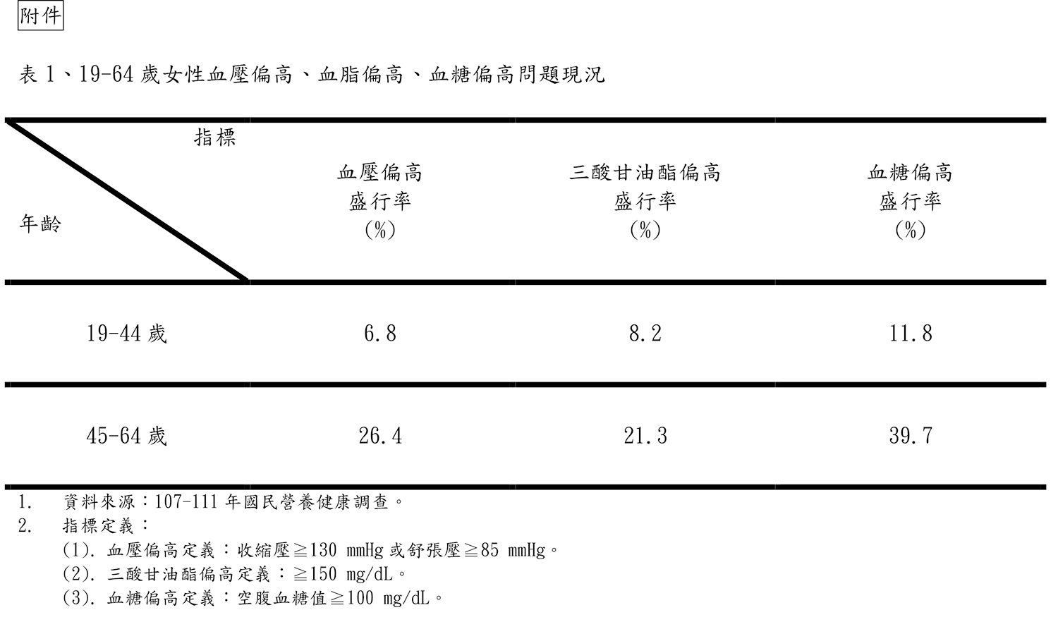 更年期是婦女生命歷程中自然且必經的階段,大約在45至55歲期間,隨著卵巢功能衰退,女性荷爾蒙分泌減少,導致更年期婦女基礎代謝率降低、體脂肪容易囤積、提高心血管疾病發生風險。依據107-111年國民營養健康調查結果顯示,45-64歲女性血壓偏高、血脂偏高、血糖偏高盛行率達26.4%、21.3%、39.7%,約為19-44歲女性的3.9倍(6.8%)、2.6倍(8.2%)、3.4倍(11.8%),隨年齡增加,三高異常盛行率有升高情形。國民健康署吳昭軍署長提醒,更年期婦女應定期監測自我健康狀況,維持良好生活習慣,遠離心血管疾病風險。