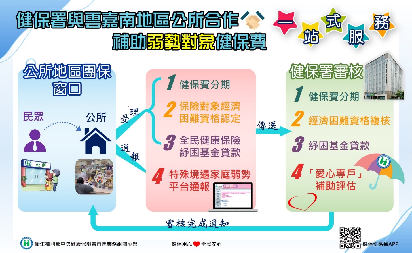 中央健康保險署南區業務組連結雲嘉南地區77家鄉鎮市區公所,為強化在地服務品質,提供一站式協助申請補助健保欠費,提高行政效能,民眾可就近在戶籍地公所申請健保欠費分期繳納或經濟困難的各項協助。