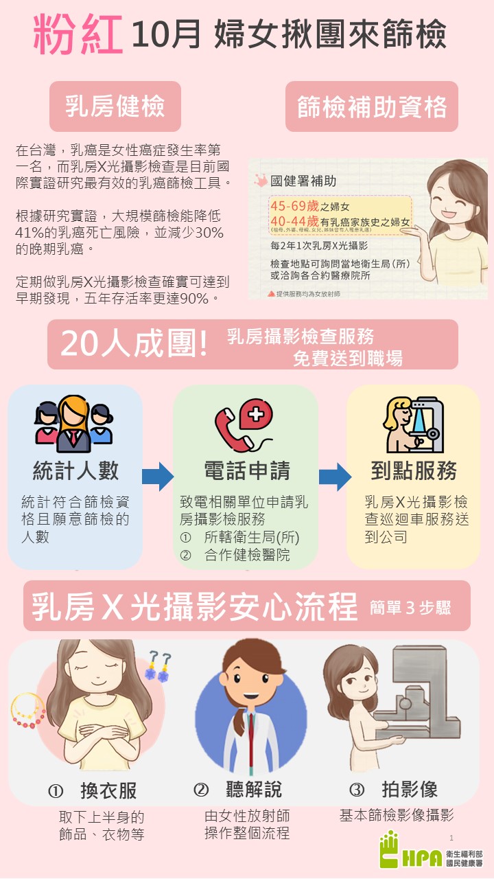 國民健康署補助45歲以上至未滿70歲婦女,及40歲以上至未滿45歲具乳癌家族史(指祖母、外婆、母親、女兒、姊妹曾有人罹患乳癌)婦女,每2年1次乳房X光攝影檢查。全國共有213家醫療機構及84台乳房攝影檢查巡迴車可提供服務,109年1月至9月累積約有63萬人接受乳房X光攝影檢查,已找到約2,700名罹患乳癌。今天於國際乳癌防治月10月前夕,國民健康署吳副署長昭軍與台灣乳房醫學會曾令民理事長、優良健康職場代表華歌爾、中華電信和臺北市政府衛生局,共同參加記者會,呼籲更多職場揪團。