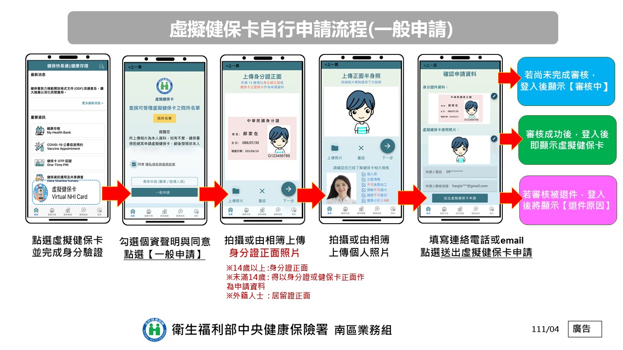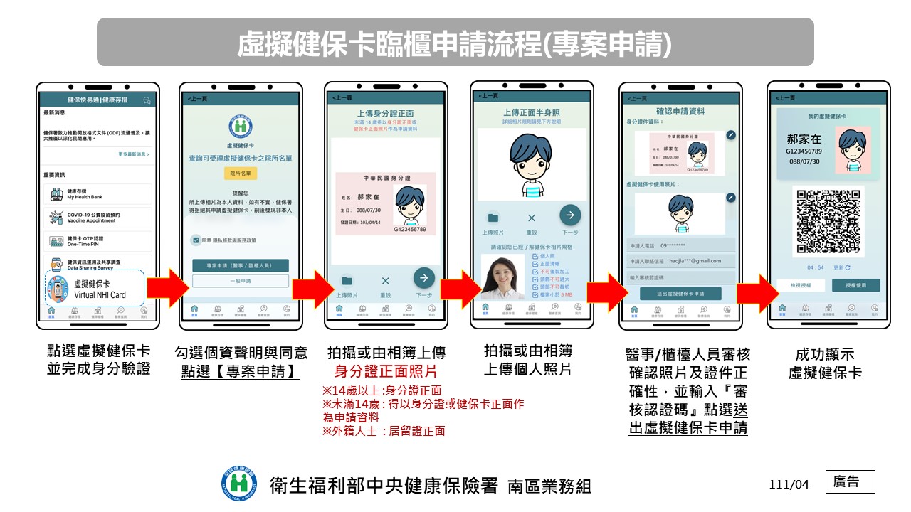 健保署表示,完成虛擬健保卡申請後,就醫時只要出示手機的QR code就可以完成掛號、看診、檢驗及檢查。近期面臨染疫人數快速增加,建議民眾可透過虛擬健保卡視訊診療,完成零接觸看診,降低就醫染疫風險,亦可多加利用健保快易通APP查詢申辦健保業務。相關作業如有不清楚或有疑問,可撥打健保署諮詢專線︰0800-030-598,手機請改撥02-4128-678洽詢。