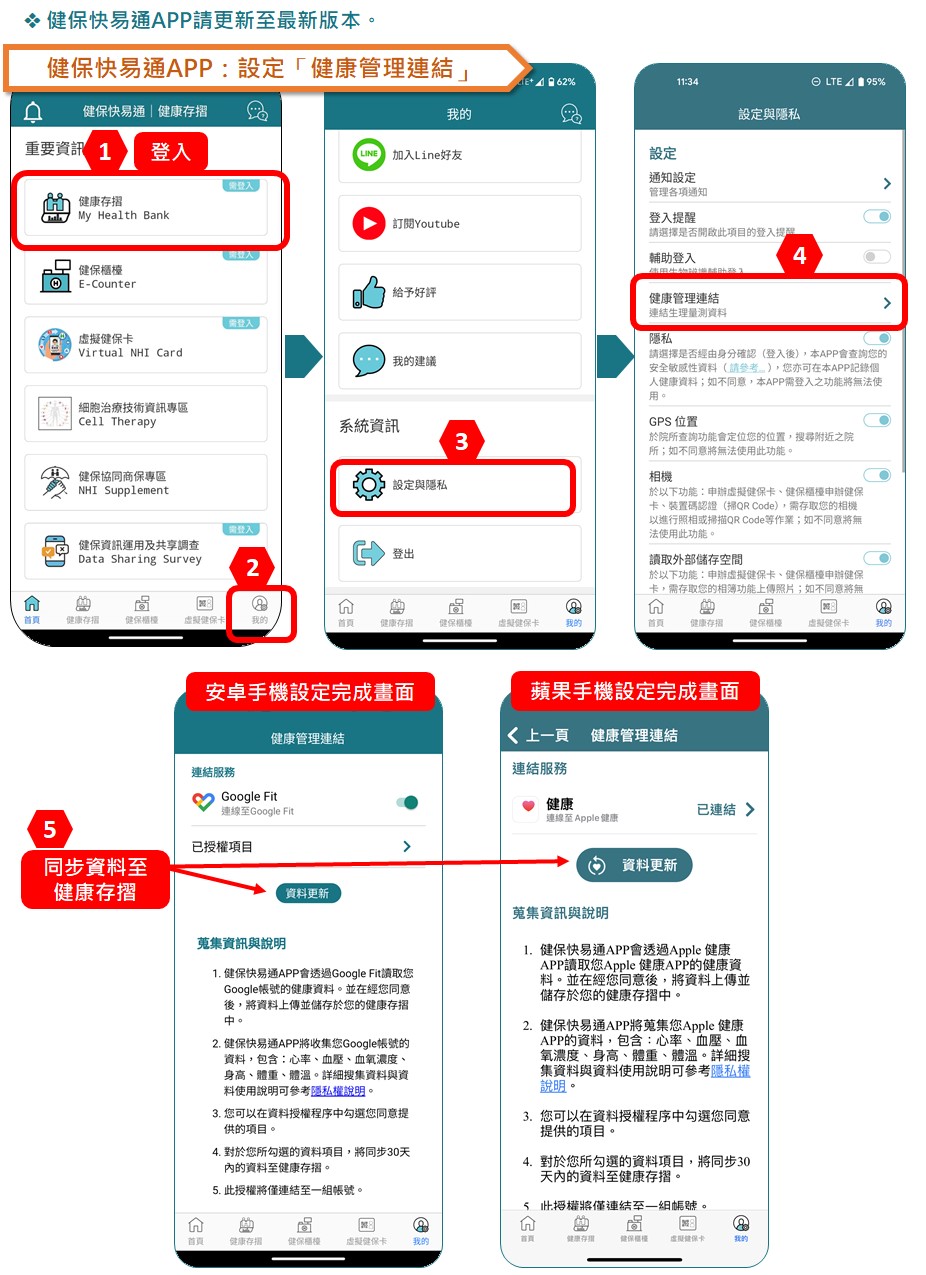 手機內建健康APP的健康數據,只要在初次設定完成後,按下「資料更新」鍵即可更新健康存摺內的生理量測值。操作流程如下:1.登入「健保快易通APP」。2.點選「健保快易通APP」右下方「我的」>「設定與隱私」>「健康管理連結」,啟動Google Fit/Apple Health的綁定後,可授權同步生理量測項目資料(每次同步會覆蓋近30日資料),目前可設定同步的項目包括心率、血壓、血氧、身高、體重及體溫等資料,民眾亦可自行在健康存摺內鍵入健康數據。