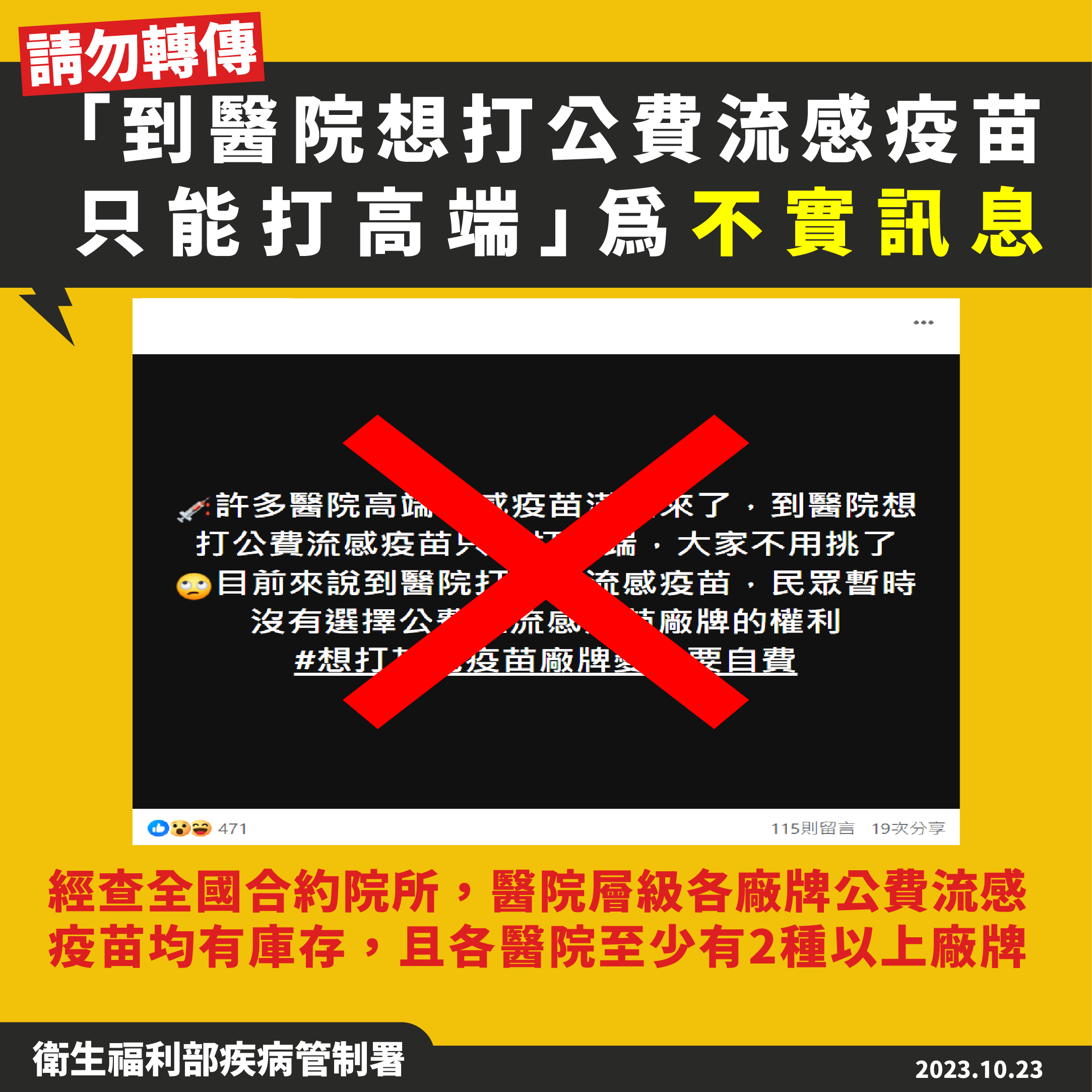 有關某醫師於社群媒體貼文指出,「目前到醫院打公費流感疫苗只能打高端,民眾暫時沒有選擇公費流感苗廠牌的權利」,疾管署今(23)日鄭重澄清如下: