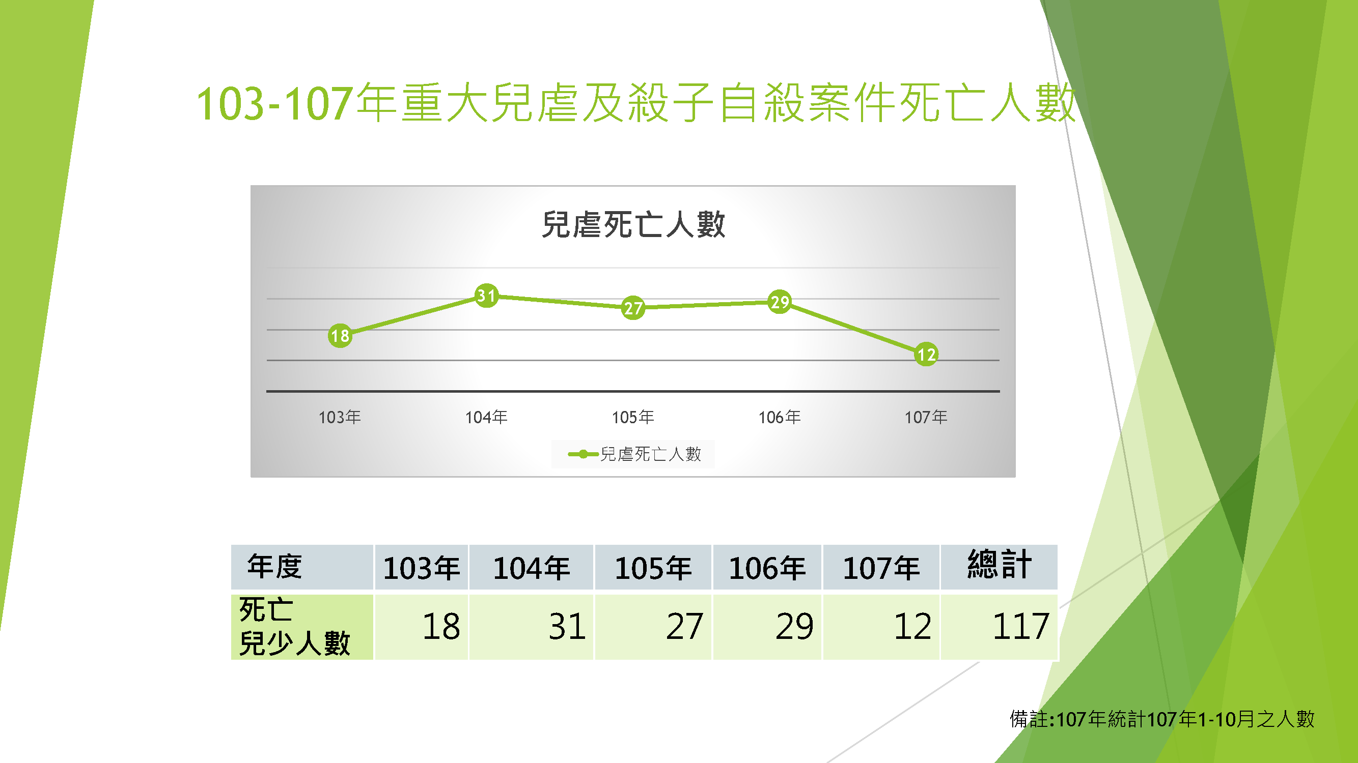 - 兒虐致死人數已大幅減低:事實上,統計今年一月至十月止,因兒虐致死人計12人,較去年死亡29人,確已大幅降低。