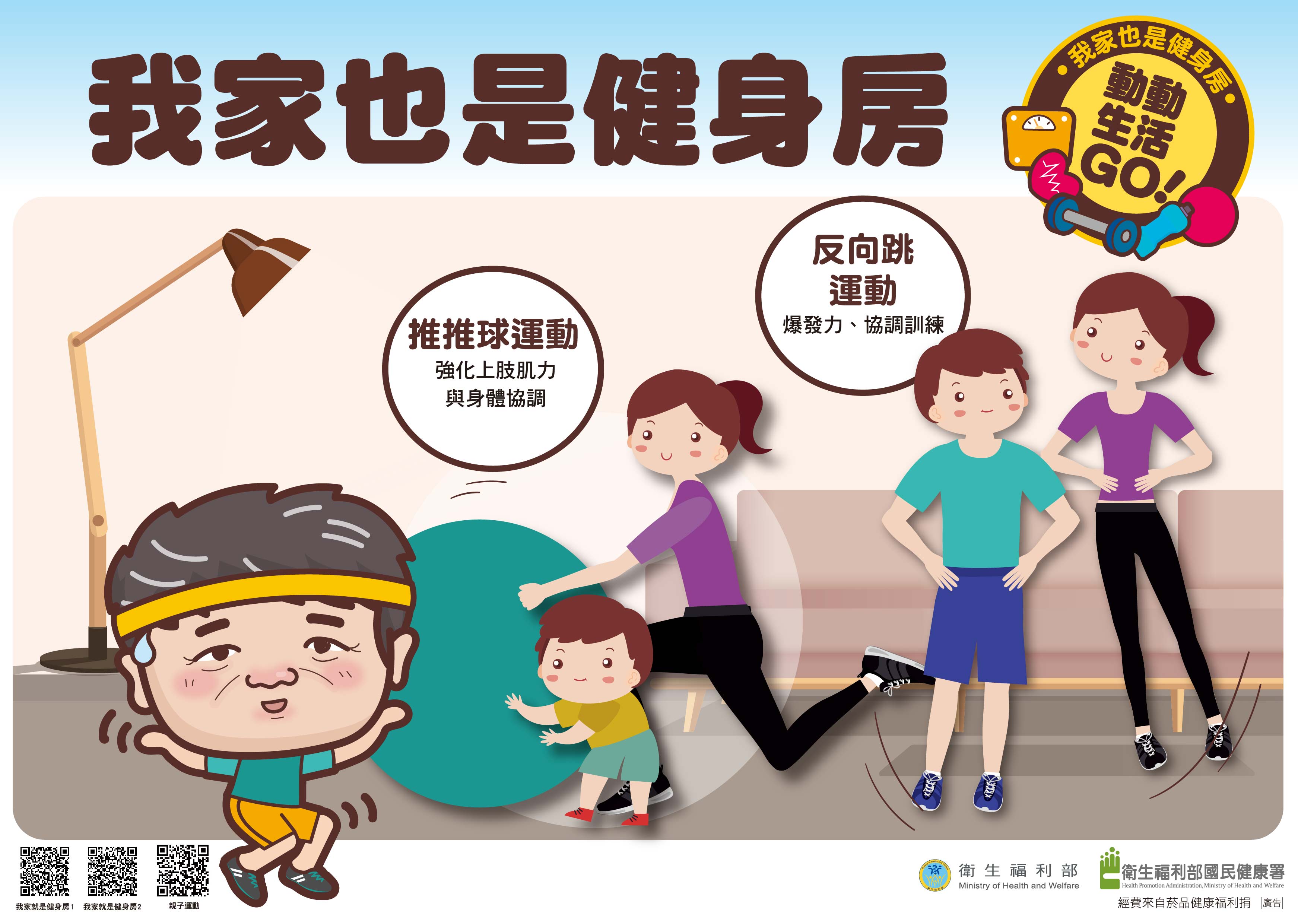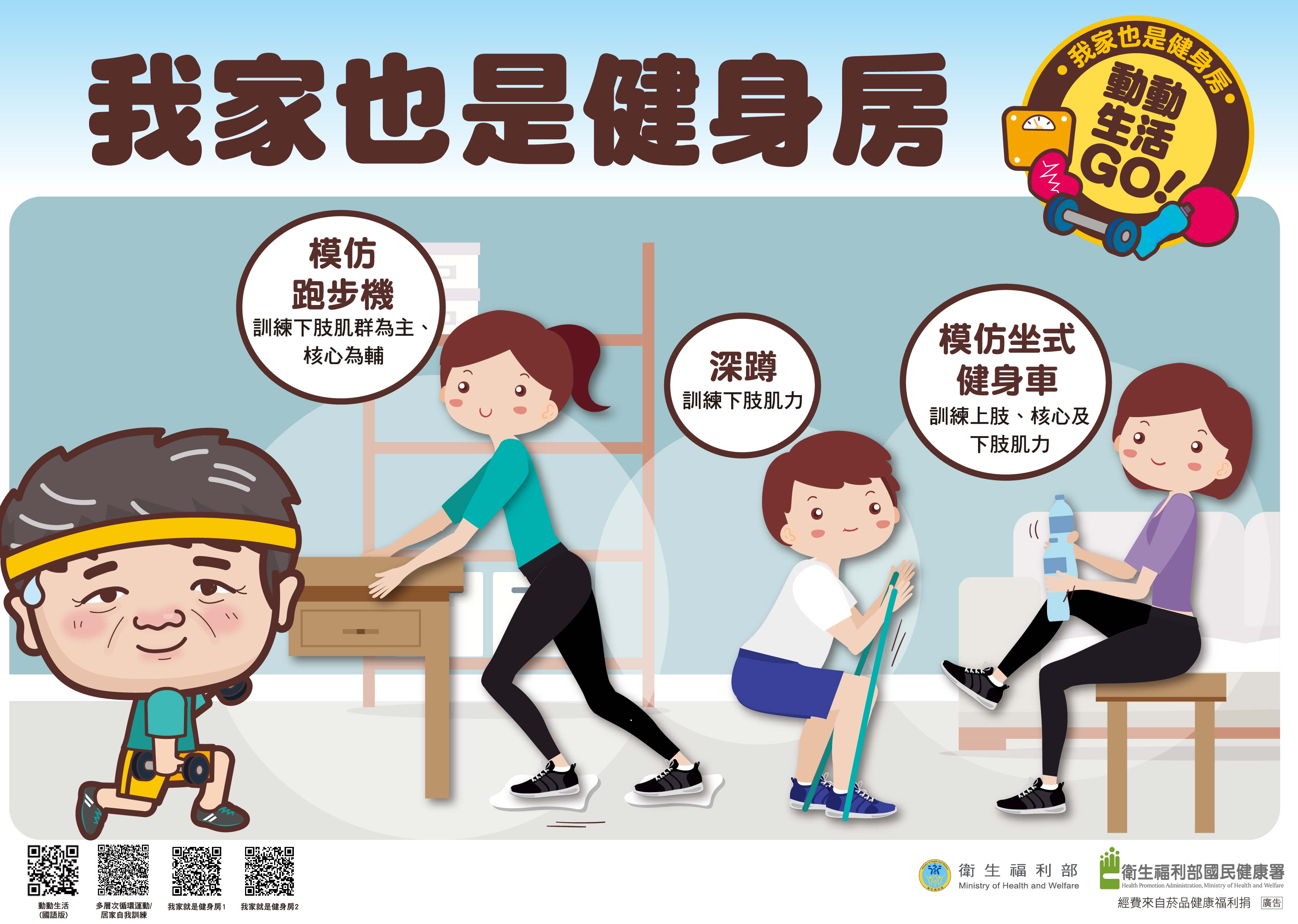 依據我國「國民健康訪問調查」,我國國人每日平均久坐5.9小時,每週身體活動量未達WHO建議標準占47.3%,而根據澳大利亞2011年研究結果,久坐1小時會減少約22分鐘的平均餘命。為鼓勵民眾隨時隨地找時間運動,國民健康署邀請宋語涵韻律體操國手及林正籃球國手一同分享運動的好處,並教您以下5招式,無需特殊裝備,不受場地的限制,只需換上輕便運動裝束與準備兩瓶礦泉水,運用隨手可得的毛巾、彈力帶等物品,就能隨時隨地健身,增加身體活動量,運動程度不亞於上健身房。