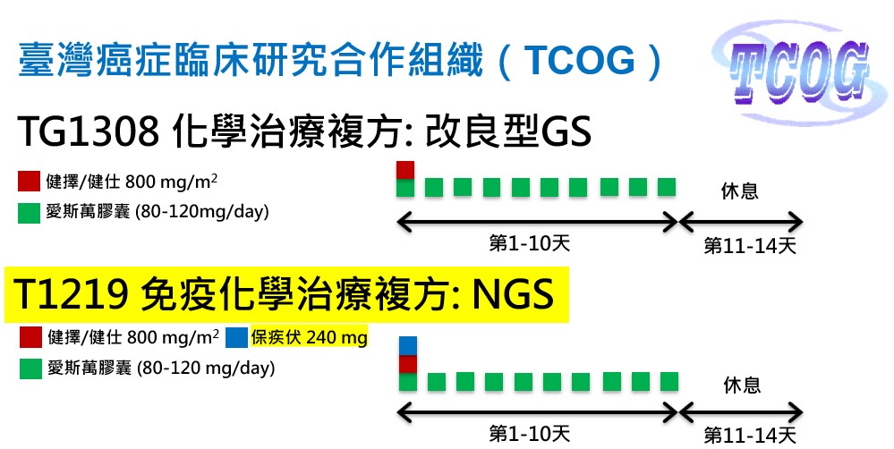由於改良型GS處方具有相當良好的耐受性,研究團隊更進一步使用改良型GS處方加上每兩周注射一次免疫治療藥物nivolumab (保疾伏),簡稱NGS處方,新的臨床試驗T1219總共收治了48名晚期膽道癌患者,初步分析發現,高達45%病患腫瘤會明顯縮小,整體中位存活期長達19個月,有3名患者腫瘤經過NGS治療後甚至成功切除所有腫瘤。NGS處方除了療效令人驚艷外,只有6%的病患發生嚴重白血球低下的副作用,可以做為台灣膽道癌新的標準治療。