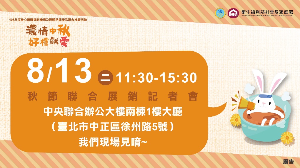 一年一度的中秋佳節又將來到,身心障礙朋友早就已經發揮無限巧思與創意,準備好各式各樣健康美味的秋節禮盒,等著大家來選購。就在8月13日上午11點30分,在中央聯合辦公大樓南棟大廳(臺北市中正區徐州路5號),衛生福利部與20家全國身心障礙福利機構、團體及庇護工場共同展攤,除了精彩的表演,更有一系列的闖關活動與有獎徵答,歡迎大家踴躍到現場跟我們一起品嚐美味,一起享受熱鬧又開心的一天!