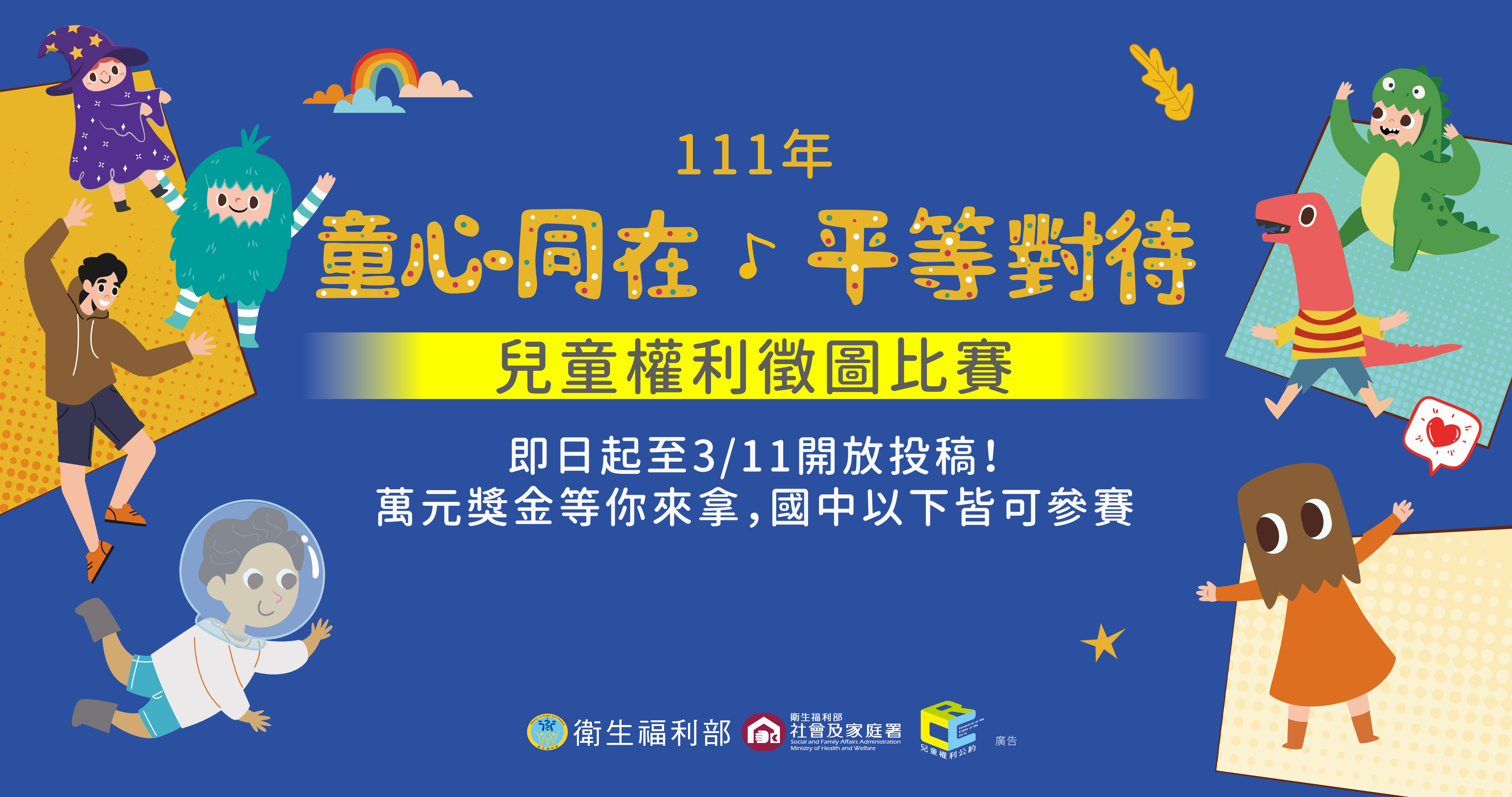 為營造兒童少年友善成長環境,正向引導兒童及少年學習尊重差異,衛生福利部社會及家庭署今(111)年主辦「童心同在·平等對待」-兒童權利徵圖比賽,即日起至3月11日辦理收件,邀請就讀國中、國小及學齡前孩子們拿起畫筆,畫下自己的不歧視宣言!