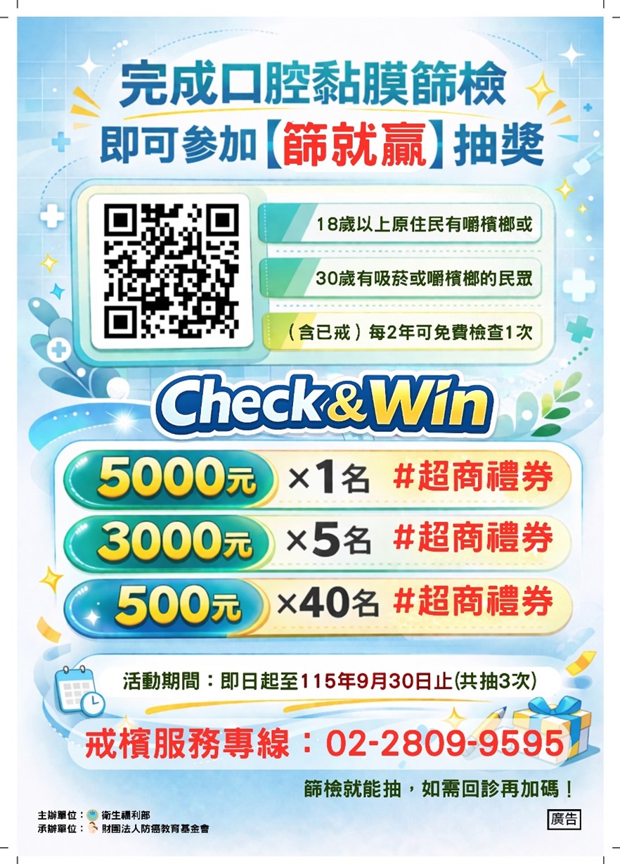 為推動高嚼檳職場檳榔防制工作及營造無檳文化,本部委託財團法人防癌教育基金會辦理115年度「Check & Win 篩就贏活動」,活動期間自即日起至115年9月30日止,凡18歲以上原住民或30歲以上民眾符合有吸菸或嚼檳榔之行為,完成本部預防保健服務口篩者,掃描活動QR code線上填寫基本資料及完成「檳榔健康危害暨宣導意見調查問卷」後即可參加抽獎,活動將於6月、8月及10月抽出幸運得主,每次抽獎獎勵為超商禮券:5,000元1位、3,000元5位、500元40位),另後續依醫師建議完成回診追蹤檢查,衛生福利部將於口腔癌篩檢系統篩選名單,於10月出「追蹤獎」(超商禮券500元30位);活動詳細說明如附件。