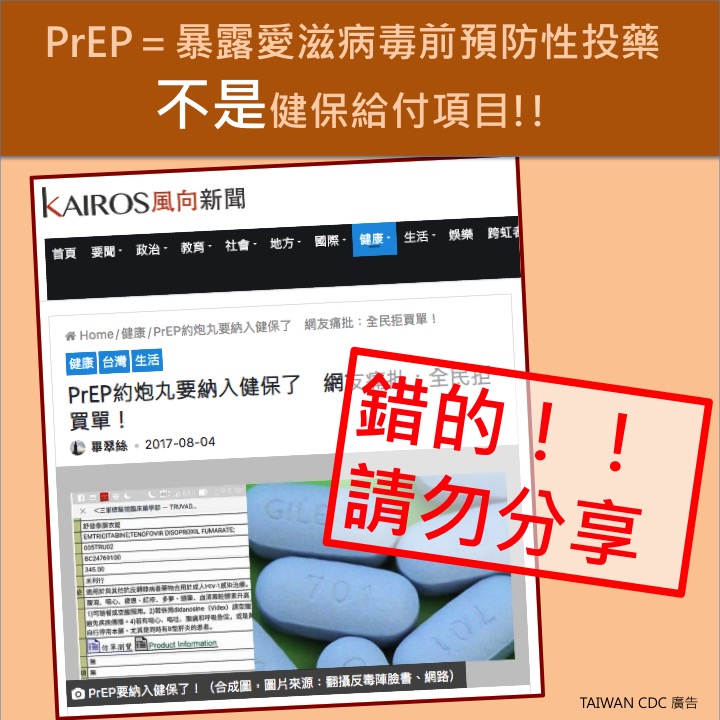 有關某媒體於2017年8月初報導「暴露愛滋病毒前預防性投藥(PrEP)要納入健保給付」,報導中表示傳聞PrEP將在當年8月底納入健保,然而該報導亦未經求證及平衡報導,近期陸續有民眾未知此報導為錯誤訊息,而加以轉發,疾管署澄清說明如下: