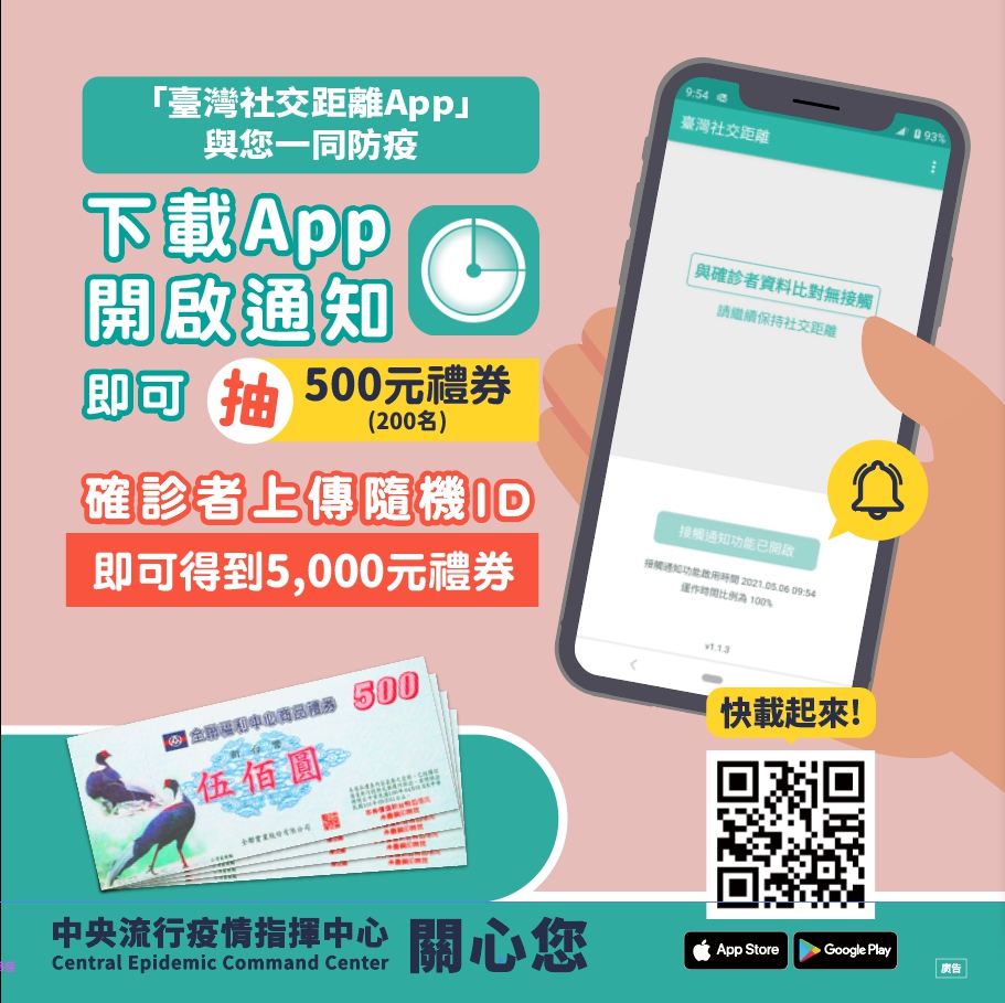 指揮中心鼓勵全民下載使用「臺灣社交距離App」,確保社區民眾安全,並將於衛生福利部疾病管制署官方臉書專頁「疾病管制署─1922防疫達人」辦理抽獎活動。另下載使用者若為確診病例且願意上傳去識別化接觸資料,將給予協助疫調獎勵金每人5,000元。相關抽獎活動辦法可至「疾病管制署-1922防疫達人」臉書專頁瀏覽。