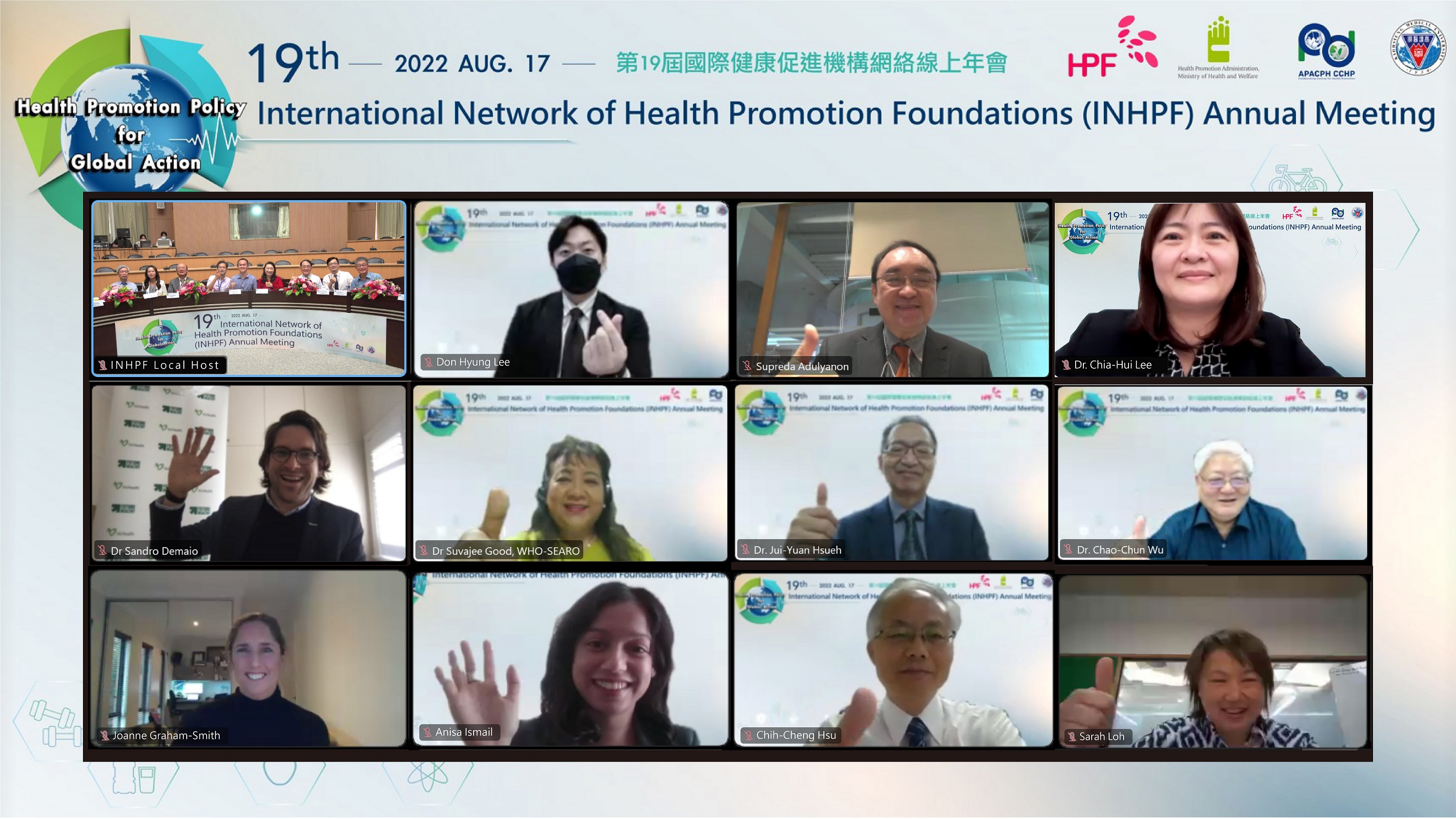 衛生福利部國民健康署與國際健康促進機構網絡(International Network of Health Promotion Foundations, INHPF) 於8月17日辦理第19屆國際健康促進機構網絡線上年會,因應COVID-19疫情,本次會議主要採取視訊方式辦理,共計來自超過13個國家,約260位健康促進領域專家學者及衛生官員等共襄盛舉。