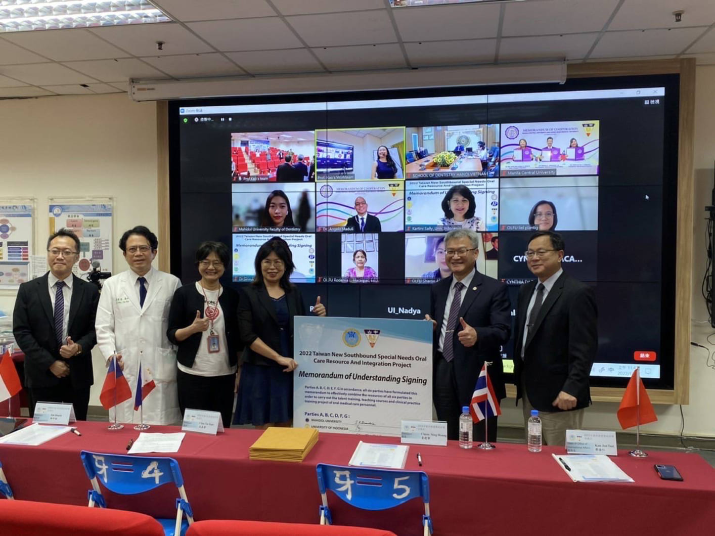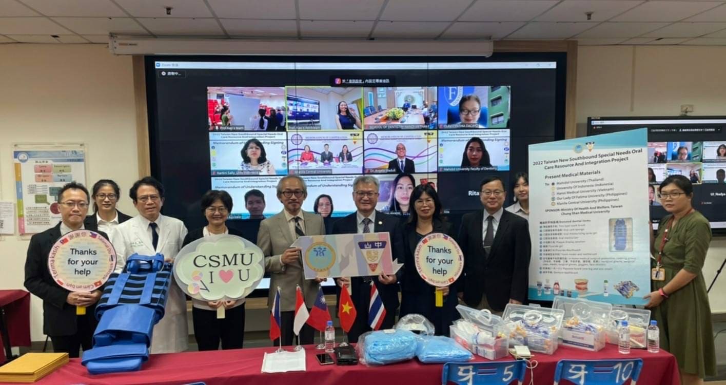 為深耕我國與新南向國家口腔醫衛合作,衛生福利部委託中山醫學大學辦理「新南向特殊需求者口腔照護及資源平臺整合計畫」,111年10月5日由中山醫學大學與菲律賓馬尼拉中央大學、菲律賓法蒂瑪大學、印尼大學、泰國瑪希墩大學、越南河南醫科大學,共來自4個國家之5所大學代表簽署「醫衛合作備忘錄」,以強化與新南向國家專業人才合作關係,積極推動我國口腔特色醫療專業並鏈結牙材產業。