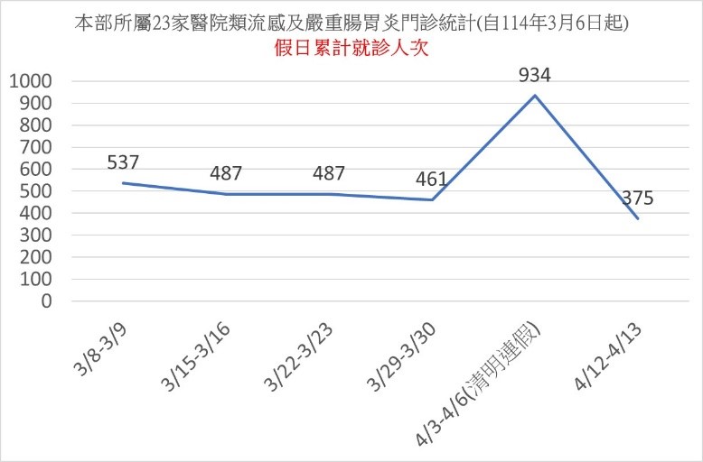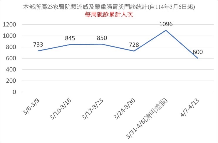 本部所屬21家綜合醫院於114年3月6日起為減緩急診壅塞及配合疫情的需要加開類流感及嚴重腸胃炎門診(周一至周六上午或下午及夜診,假日合併急診),並給予優先看診,以快速之醫療服務,減少病患在醫院停留時間。從3月起部屬醫院每月加開924診,迄至昨日已服務民眾近5千人次(類流感2,442人、腸胃道2,368人),其中以清明連假及週六、日假日兩天病例最多,(類流感1,505人、腸胃道1,706人),高峰期係落於114年3月31日至114年4月6日清明連假當週,部屬醫院發揮公醫使命及公衛責任迅速應變調整增加診次與結合綠色通道,有效減緩病人集中至大醫院急診排隊之困擾,醫福會林慶豐執行長表示:近期氣溫雖有回暖,但日夜溫差明顯,呼籲民眾勿輕忽流感嚴重性;應落實勤洗手及注意咳嗽禮節等個人衛生防護措施,有呼吸道症狀時應佩戴口罩如有出現流感及嚴重腸胃炎相關症狀,如發燒、頭痛、喉嚨痛、咳嗽、肌肉酸痛、腹瀉等症狀,仍請民眾就近洽本部所屬醫院提供快速之服務。