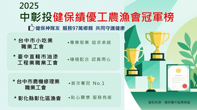 中央健康保險署(下稱健保署)中區業務組為持續提升便民服務品質,鼓勵工農漁會積極推動健保各項措施。中區業務組於今(5)日舉辦114年中彰投地區績優單位表揚活動,分大、中、小工會及農漁會4個組別,共計761家工農漁會參與評比,其中有32家脫穎而出。各組奪冠分別為:台中市小吃業職業工會、臺中直轄市油漆工程業職業工會、台中市農機修理業職業工會及彰化縣彰化區漁會。本次比賽相當激烈,得獎的單位卯足全力展現服務品質的提升,整合申辦作業一站式服務辦理各項健保加退保、換補發健保卡及政策宣導。另外,也透過E化作業流程,讓會員或眷屬前來洽辦,相當有感服務好又便捷。