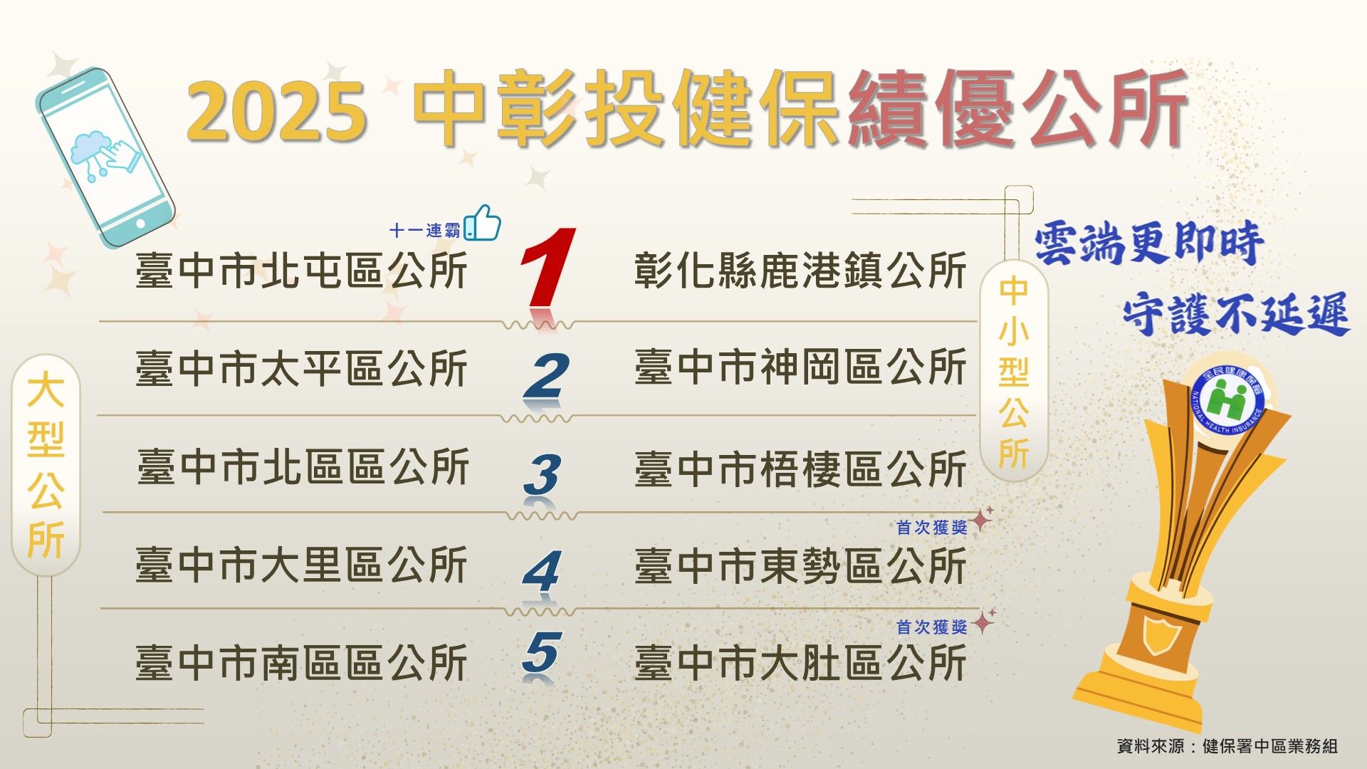 丁增輝組長強調,為鼓勵中彰投地區68家公所積極提升健保服務,中區業務組舉辦「公所健保績優投保單位評選活動」。今(114)年度由11連霸常勝軍臺中市北屯區公所、以及睽違3年強勢回歸的彰化縣鹿港鎮公所,分別拿下大型、中小型公所組冠軍。評選期間各公所積極推廣健保快易通APP數位服務,網路完成加退保及申辦健保卡近3萬件,輔導鄉親使用健康存摺做好健康管理逾1萬人,協助弱勢通報及申請補助將近300件。