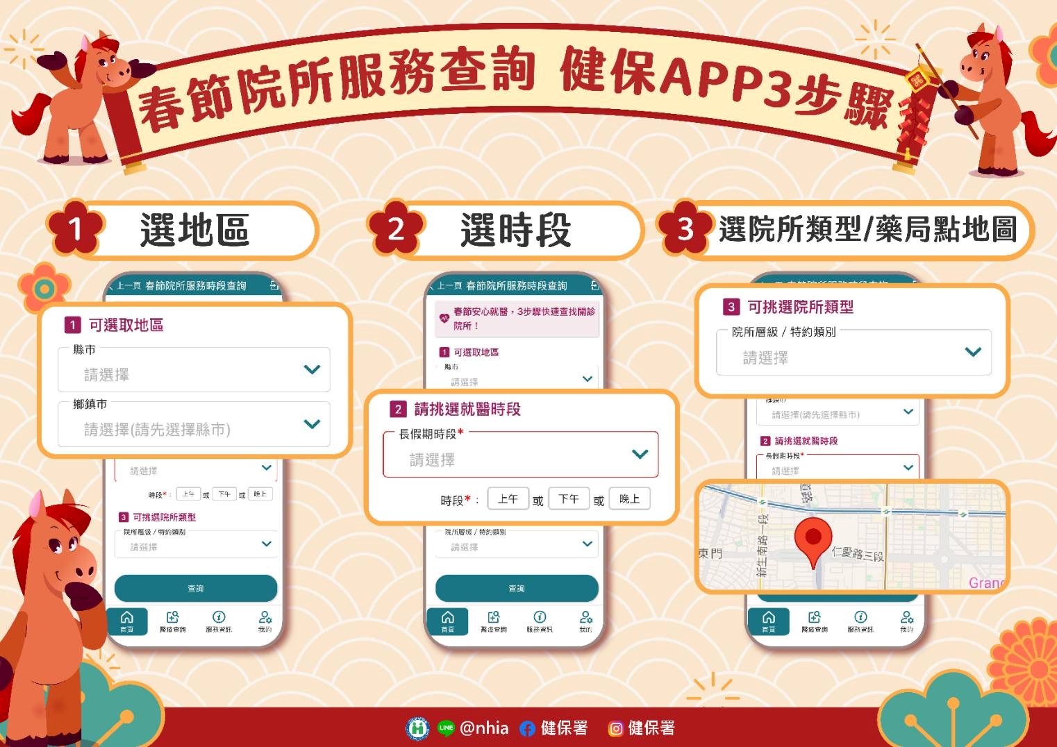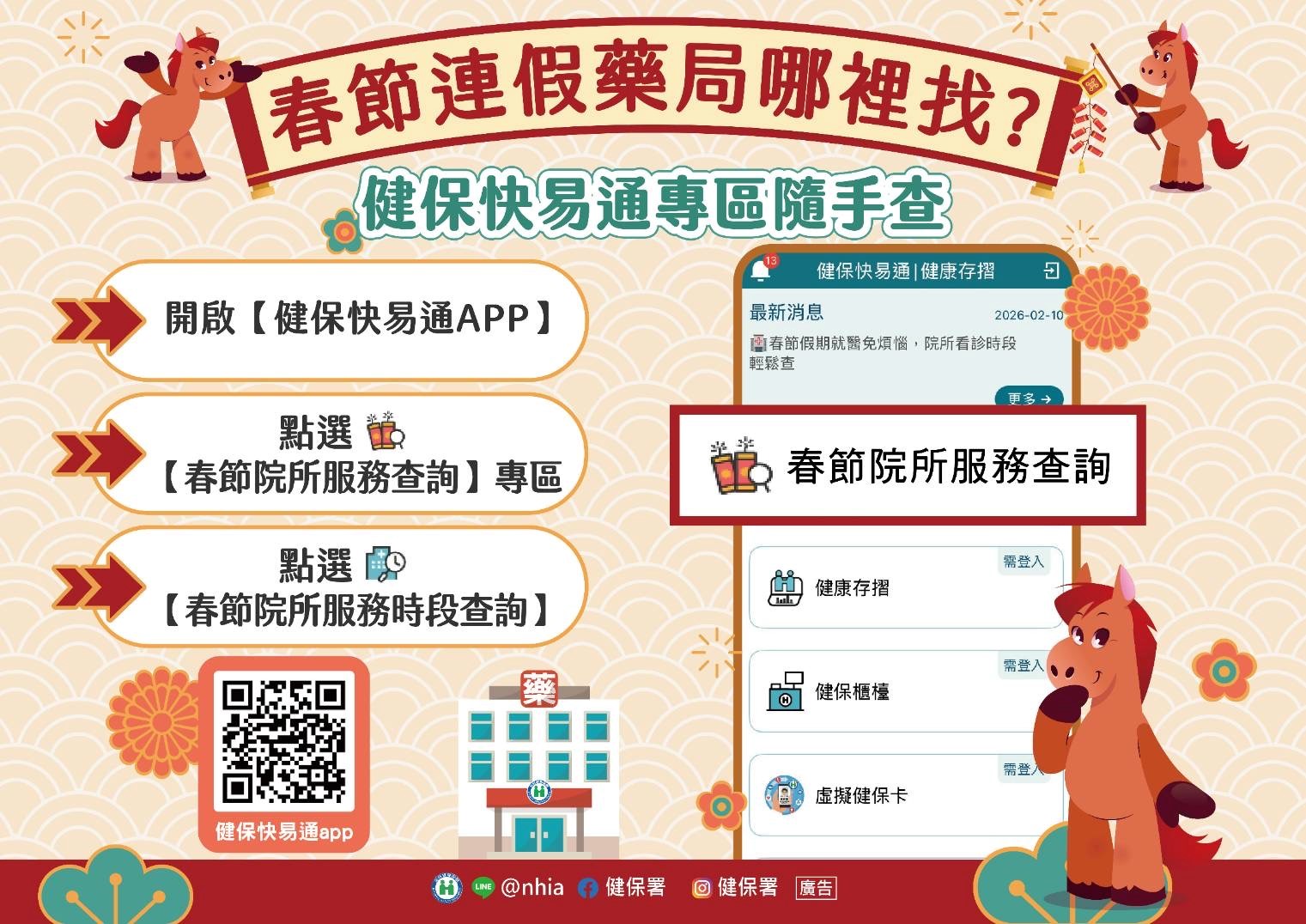 健保署補充,透過「全民健保行動快易通|健康存摺(APP)」,進入「春節院所服務查詢」專區,點選日期及時段,即可查詢醫療院所開診時段(查詢示意圖及影片QR code如附件,影片:https://youtube.com/shorts/Xo-Oh94myGQ?si=kB5GsWF9gWjlQkz0)。政府與醫療單位共同努力,全力提供民眾安心就醫,守護健康。