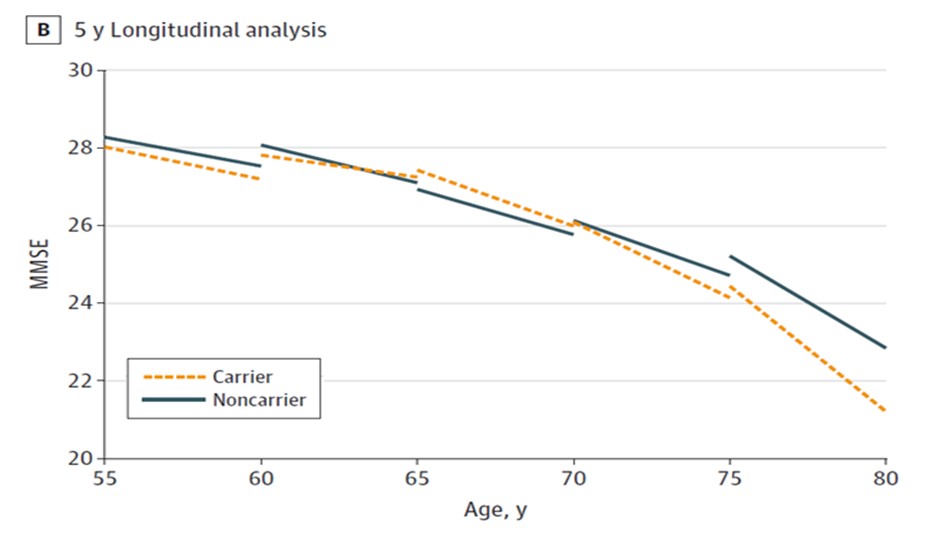 在平均約6年追蹤期間內,可觀察到不論是否攜帶ε4基因,隨著年齡增加,認知功能也會退化,但攜帶APOE ε4基因的長者(不管攜帶單一或一對ε4基因),認知功能退化將顯著加速,且呈現「攜帶ε4數量越多、認知功能退化加速越明顯」的趨勢。值得注意的是,這樣的差異多在70歲之後逐漸拉開,顯示APOE ε4基因對認知功能退化的影響,可能隨年齡累積而更加明顯。