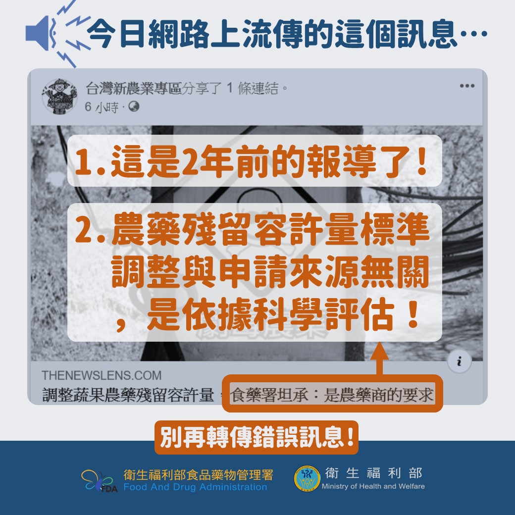 - 轉傳報導為兩年前之舊新聞:有關今日網路轉傳之「調整蔬果農藥殘留量,食藥署坦承:是農藥商的要求」報導,已為兩年前之舊新聞。