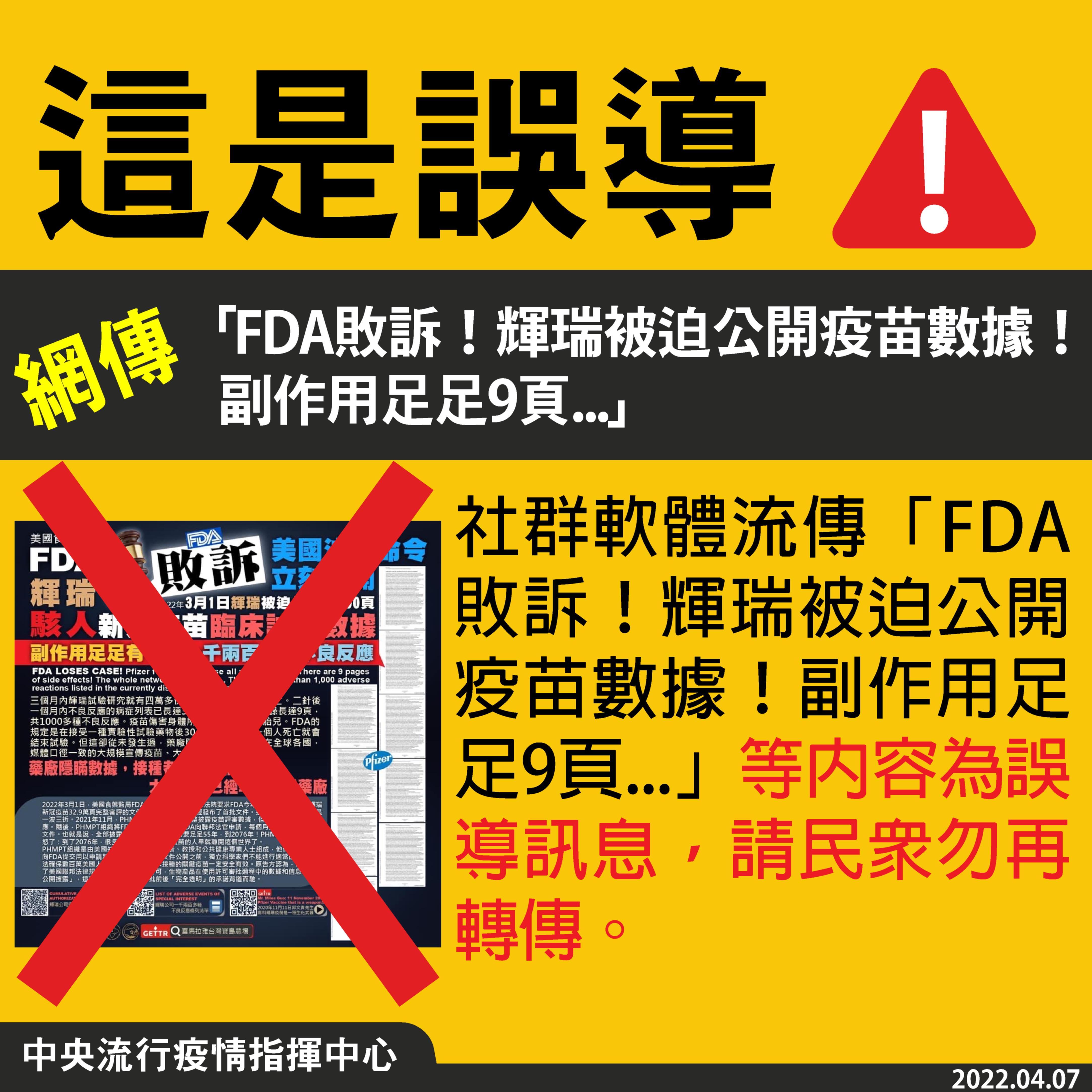 有關近日社群媒體散布「FDA敗訴!輝瑞被迫公開疫苗數據!副作用足足9頁」訊息,食品藥物管理署(下稱食藥署)鄭重澄清:我國核准專案輸入、製造的COVID-19疫苗(包括BioNTech疫苗),皆是經過衛生福利部食品藥物管理署嚴謹審查廠商所提供的疫苗品質管制資料、非臨床藥毒理試驗資料及人體臨床試驗報告,確認疫苗的品質、安全及療效後,始予以核准,民眾可安心接種。
