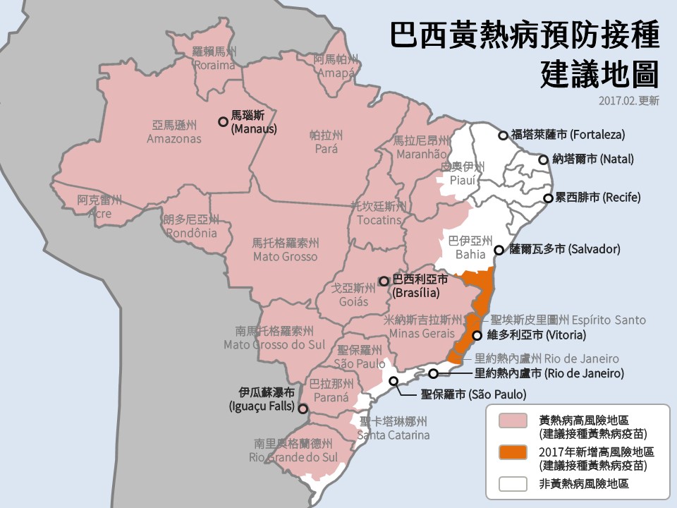 依據國際監測資料顯示,巴西今(2017)年截至1月30日累計通報568例黃熱病疑似病例,其中107例確診,113例死亡,以米納斯吉拉斯州佔近9成最多,並新增感染州別,世界衛生組織表示,因人口與動物之流動、部分地區疫苗覆蓋率低等因素,預期疫情可能擴散且傳播風險高。目前已將巴伊亞州(Bahia State)南部及西南部部分行政區、聖埃斯皮里圖州(Espírito Santo State,除維多利亞市區以外全區)、里約熱內盧州(Rio de Janeiro State)北方部分行政區新增為風險地區(如附圖),建議欲前往旅客應加強疫苗接種。