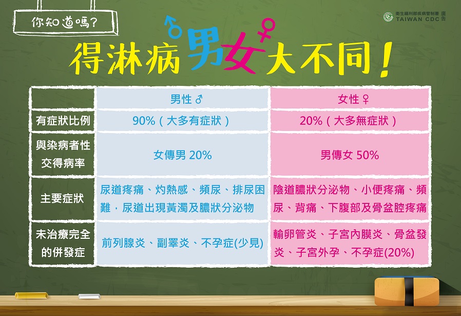 淋病主要影響生殖系統,男性感染後2至7天會出現尿道化膿,排尿有刺痛或灼熱感等症狀;女性感染後大多不會有疼痛感,症狀也不明顯,因此常被忽略,若沒有及時接受治療,不論男性或女性,都可能會造成不孕。民眾如出現疑似症狀或懷疑感染,勿自行買藥或誤信偏方,應立即就醫,相關資訊可參考疾管署全球資訊網「友善性病門診推薦醫師名單」,或可撥打國內免付費防疫專線1922(或 0800-001922)洽詢。