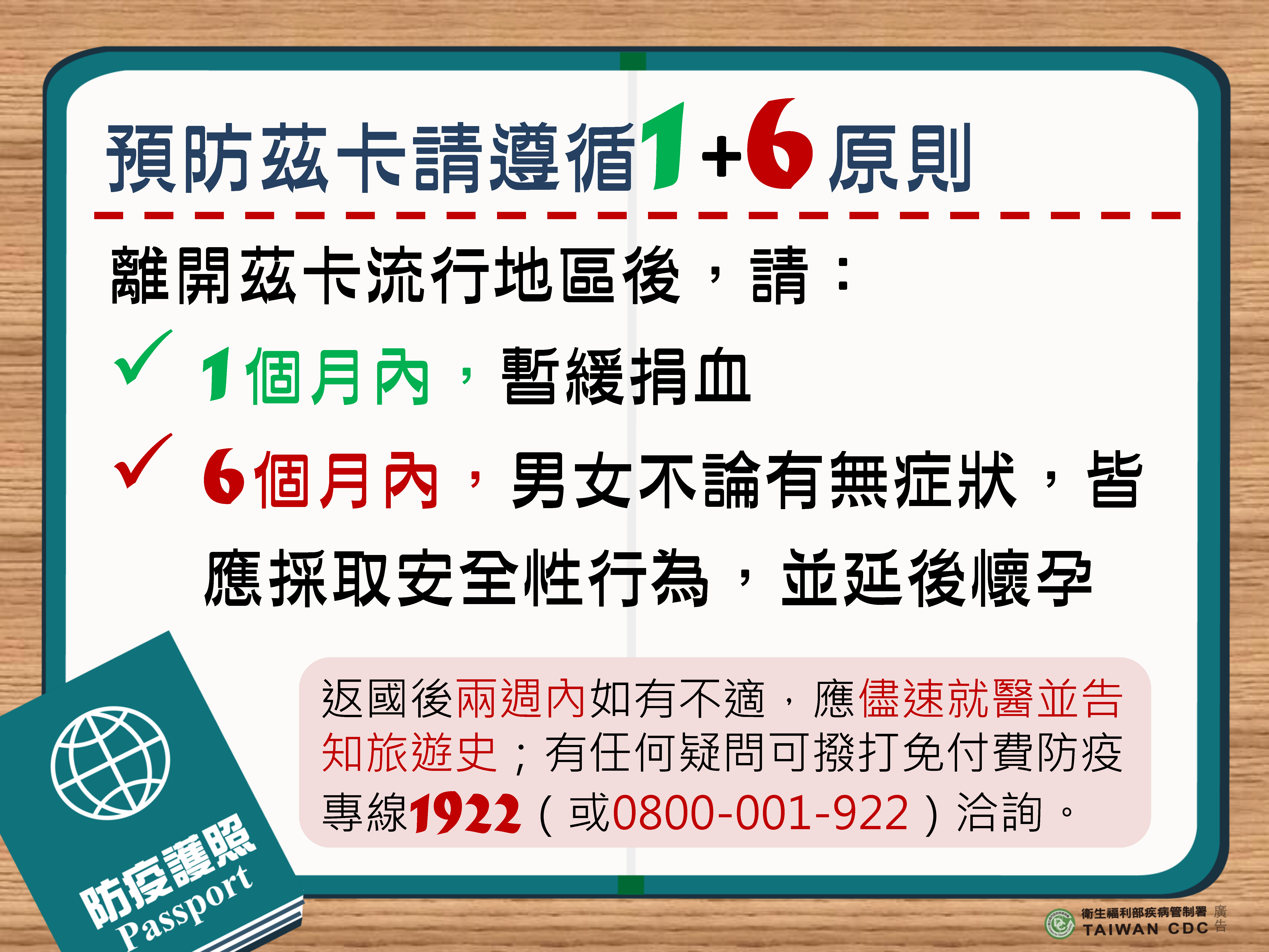 國內今年截至目前共計8例茲卡病毒確定病例,感染地分別為泰國2例,印尼、聖露西亞、聖文森及格瑞那丁、美國佛羅里達州、新加坡及越南各1例。一般成人感染茲卡病毒症狀輕微,但孕婦感染後可能導致胎兒小頭畸形或死亡,提醒孕婦及計劃懷孕婦女暫緩前往流行地區;民眾如必要前往,應做好防蚊措施,離開流行地區後請依循「1+6原則」進行防護措施,1個月內應暫緩捐血,6個月內男女無論有無症狀,都應採取安全性行為及延後懷孕。