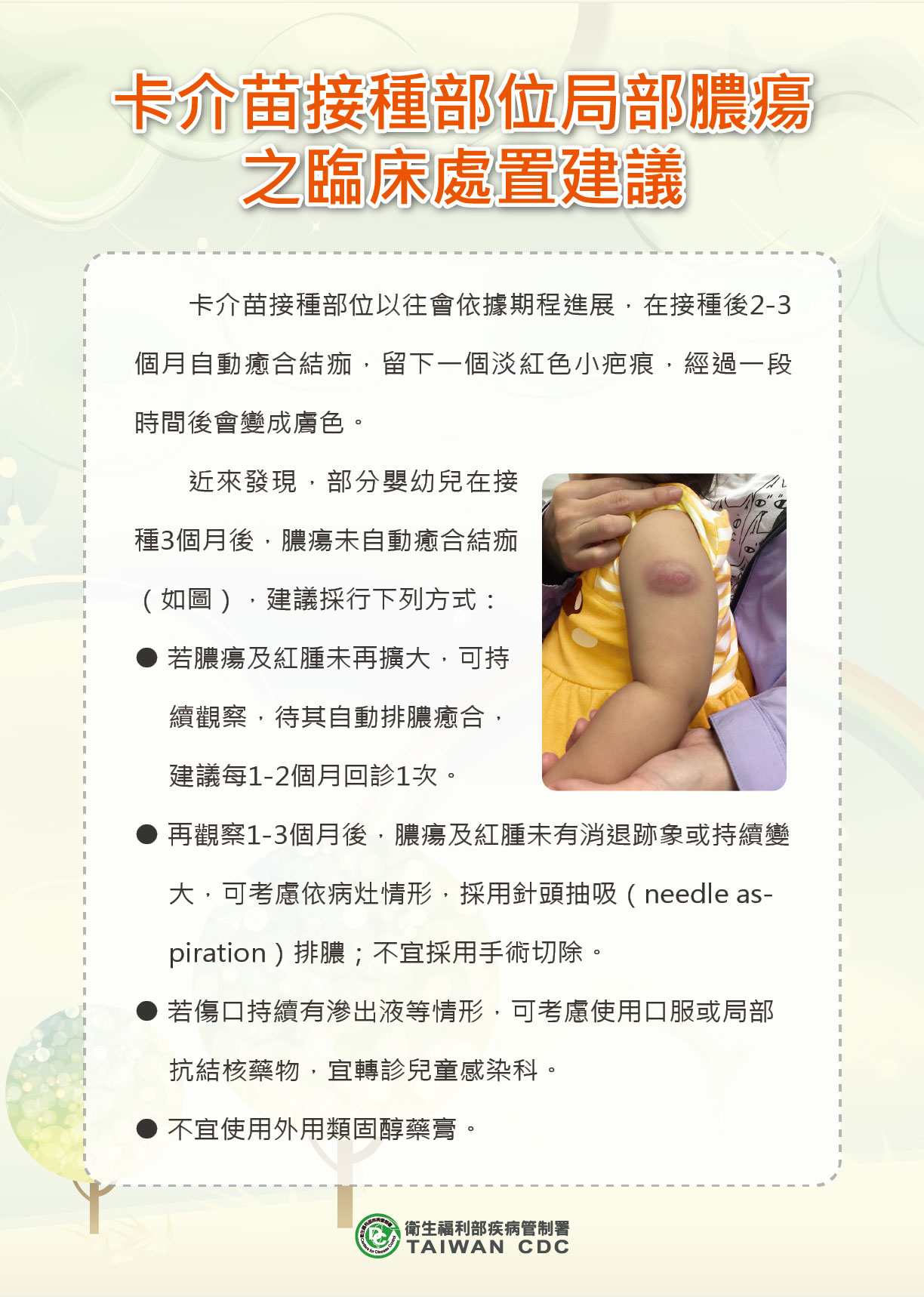 卡介苗接種部位一般在接種後2至3個月會自動癒合結痂,留下一個膚色小疤痕,但有少部分嬰幼兒在接種3個月後膿瘍及紅腫沒有消退跡象或持續擴大,無法自動癒合結痂。為此疾管署日前邀集兒童感染症專家訂定臨床處置建議,以做為醫療院所及醫師之處置參考。