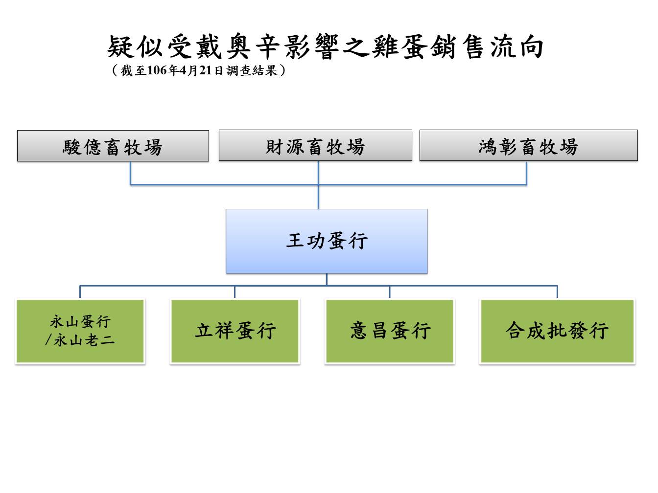 食品藥物管理署(食藥署)於4月21日要求駿億、鴻彰及財源3家蛋雞場生產的雞蛋及其下游4家盤商所有的涉疑雞蛋,須於4月22日下午3時前完成預防性下架,截至2017年4月22日17時止,衛生單位累計出動108人次,清查621家次,下架雞蛋約6,785公斤。