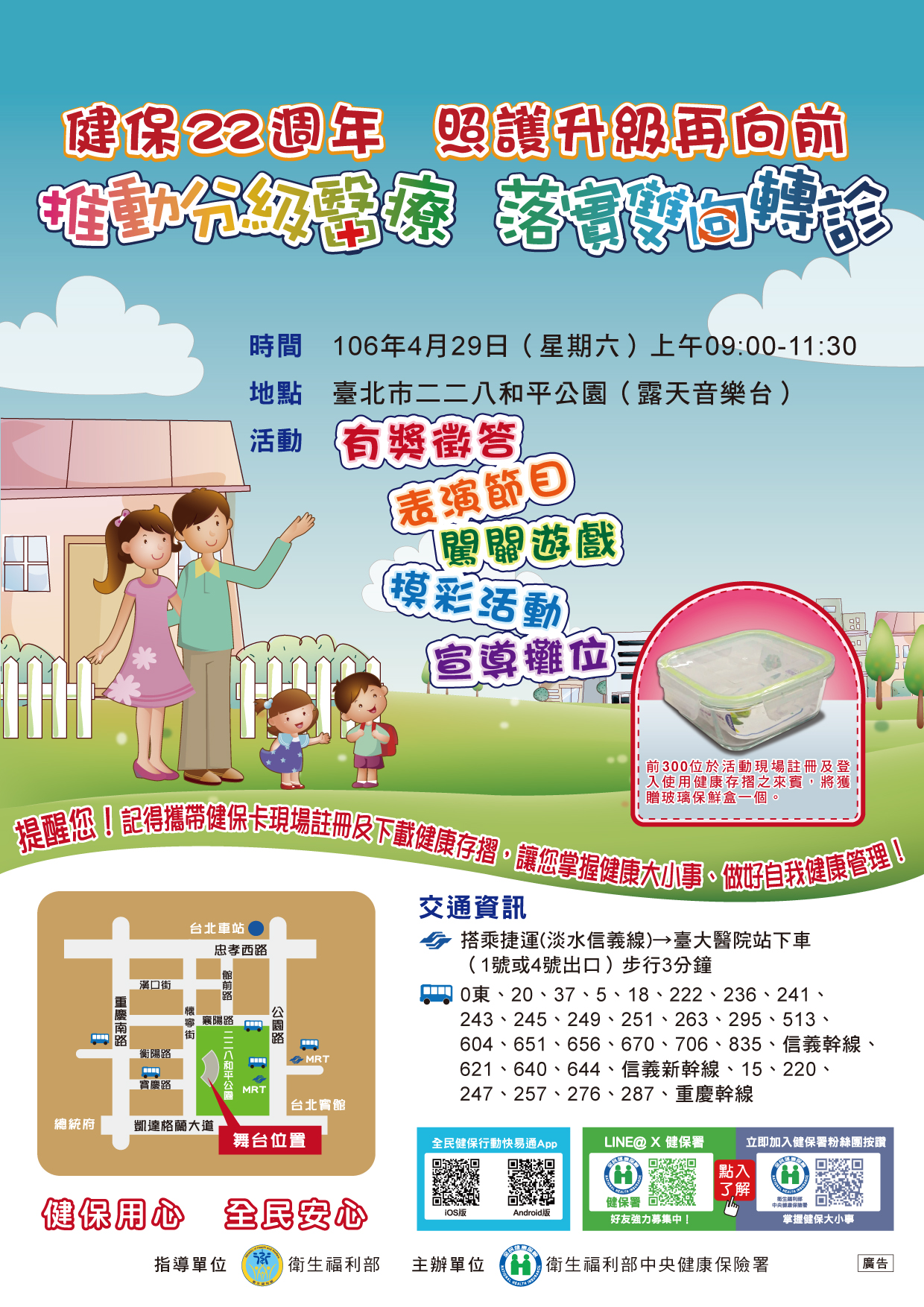 歡慶健保22周年,衛生福利部中央健康保險署臺北業務組於106年4月29日(六)上午8:30在臺北市二二八和平公園舉辦「健保22週年 照護升級再向前─推動分級醫療 落實雙向轉診」宣導活動,熱情邀請民眾扶老攜幼走向戶外,共同迎向健康歡度愉快週末。