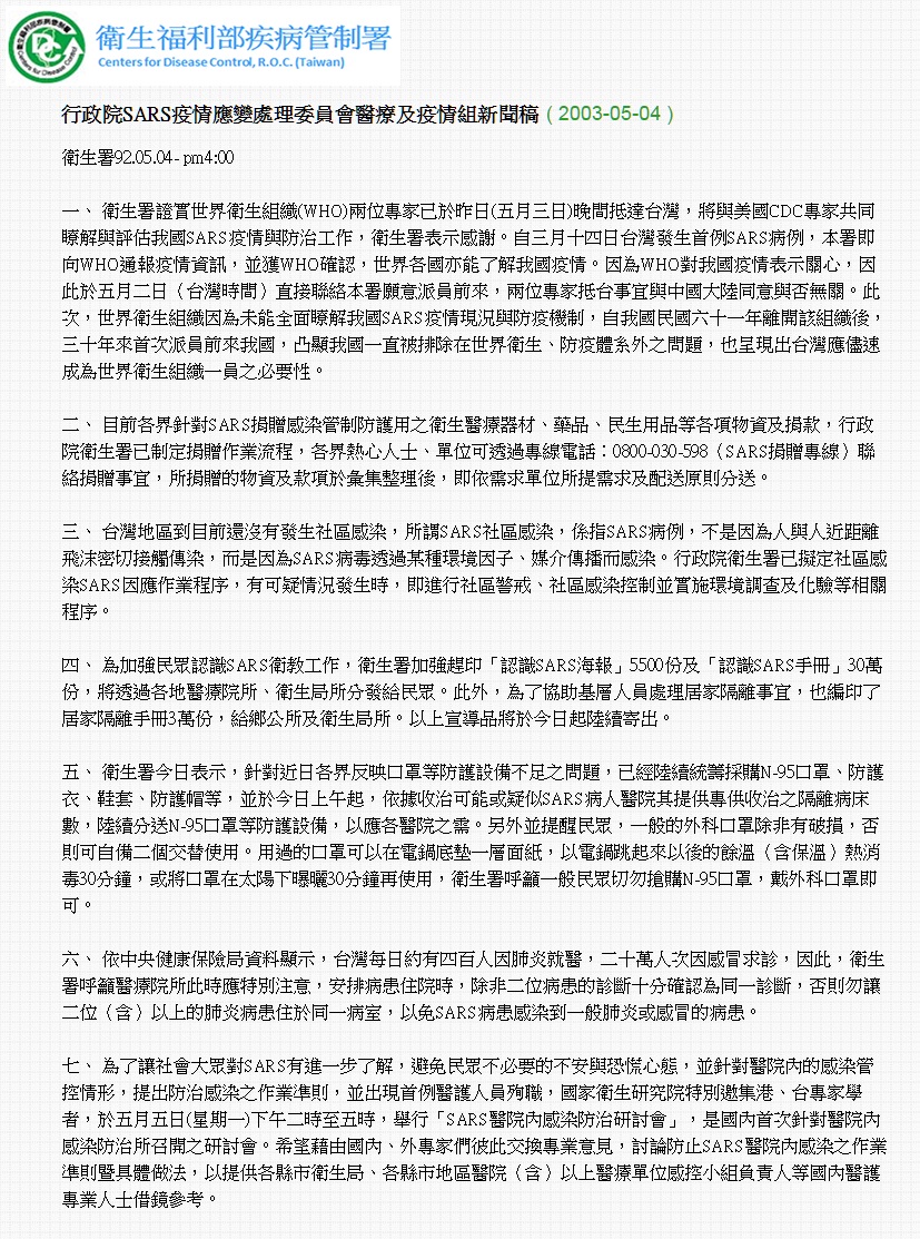 我國2003年3月14日出現首例SARS病例後,即向世界衛生組織(WHO)通報,並獲WHO確認,世界各國亦能了解我國疫情;WHO因對我國疫情表示關心,3月21日主動與我國聯繫,並於5月3日派員來台協助疫情,專家抵台事宜與中國大陸同意與否無關。
