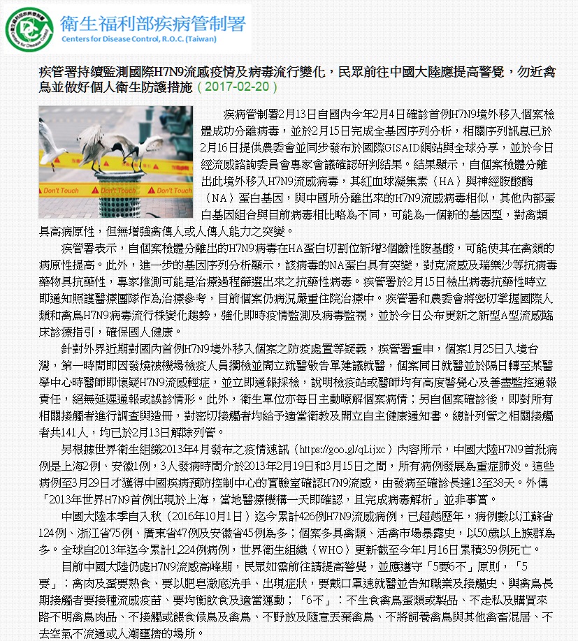 今(2017)年2月台灣H7N9首例境外移入病例,我國疾管署2月4日確診,2月13日病毒培養成功,病毒序列2月16日上傳至國際公開資料庫(GISAID),引起國際社會對H7N9變異病毒的注意,疾管署亦將相關資料整理投稿至臺灣醫誌,且於3月1日接受刊登(J Formos Med Assoc. 2017 116:210-212),中國大陸遲至2月19日才將相似的病毒序列公布上傳至GISAID,並通報世界衛生組織病毒變異。並非「對岸廣東疫控中心2月發布H7N9基因突變訊息,才讓台灣解開該病例致死之謎」。