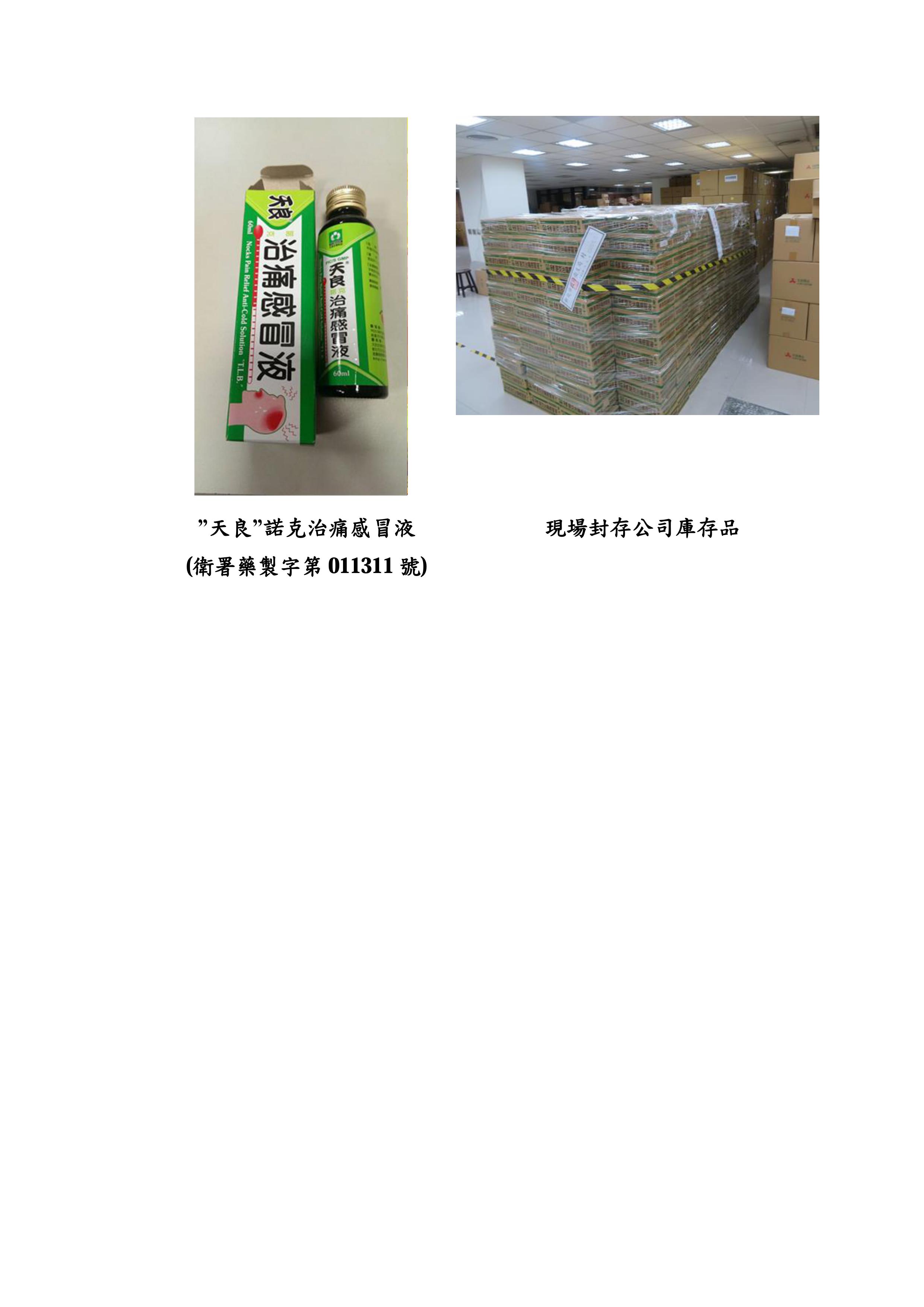 查核當時,於該公司5樓出貨區查獲改包裝、批號及效期之藥品共1524瓶,現場已立即封存,並將庫存品及待報廢品共逾16萬瓶全數封存,不准出貨。食藥署已當場責令廠商全面下架該項產品,並將發布問題藥品回收訊息,請藥局與藥商配合將「”天良”諾克治痛感冒液」下架回收,後續並將由各地方政府衛生局協助清查轄區內藥品回收情形;同時呼籲民眾如有購買該項產品,請立即停止使用,衛生局已命業者對外公布退貨機制。