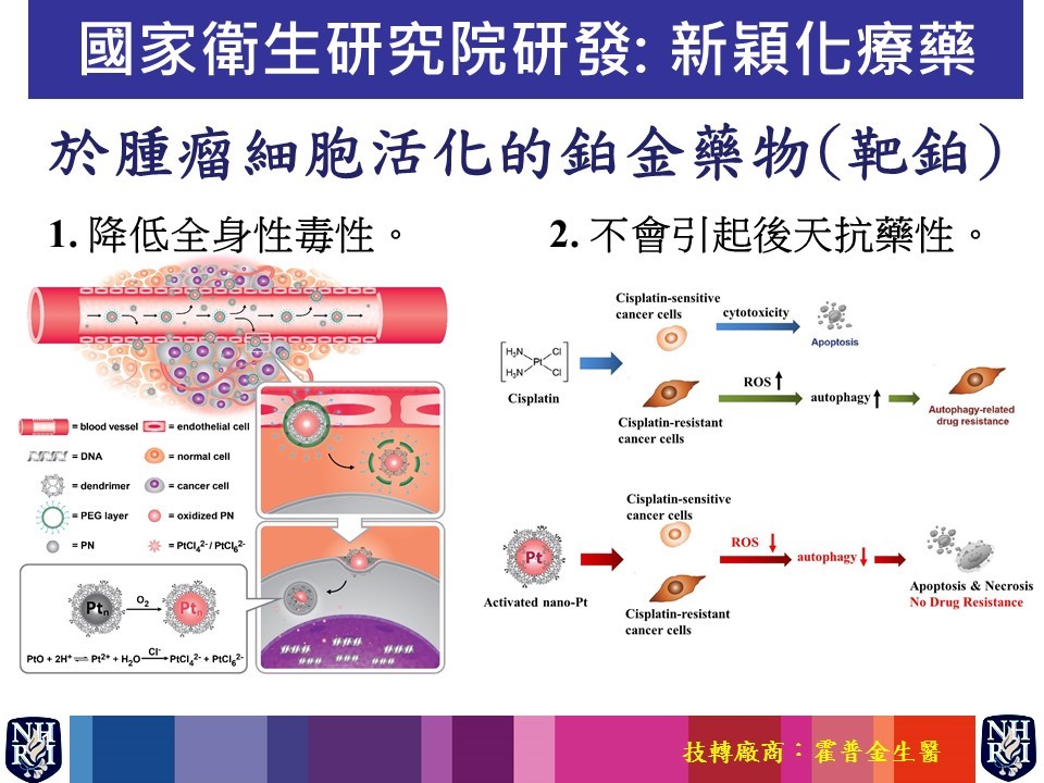 國家衛生研究院生醫工程與奈米醫學研究所林淑宜副研究員團隊研發「於腫瘤細胞活化的鉑金藥物」,有別於傳統鉑金化療藥物,此新穎藥物可避免引發全身性的毒性,且不易產生抗藥性。研究成果順利技轉霍普金生醫股份有限公司,接手推動各項臨床前試驗研究工作。此研究於2015年獲第十二屆國家新創獎「學研新創獎」,此次再獲入圍2017臺北生技獎「技轉合作獎」,不僅是對本技術的肯定,更展現國衛院在奈米醫學研究領域深耕多年所累積的研發量能。