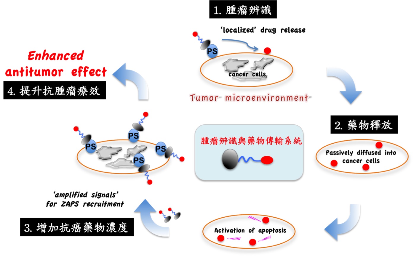 此技術亮點是以小分子胺化合物取代抗體的角色,並與已上市的抗腫瘤藥物結合,建立空間和時間控制的傳輸系統,利用大量表現在腫瘤部位的 Phosphatidylserine(PS)作為顯著的標靶,藉此精準傳遞抗癌藥物至腫瘤組織,增加腫瘤中的藥物濃度提昇抗癌藥效,達到治療效果的最大化及副作用的最小化,為全新(First-in-Class)的癌症治療方法。