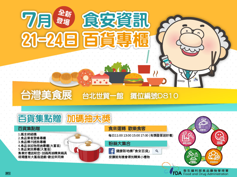 食藥署表示「食安資訊百貨專櫃」活動攤位針對國人最想了解的網路謠言、食品標示、食品添加物的用途及合法添加量等內容,設計「百貨集點贈」五關卡的食安知識學習闖關遊戲,透過活潑有趣的互動方式,讓民眾更易瞭解食安五環及食品安全管理相關規定。自7月21日至7月24日完成闖關的民眾就可獲得精美好禮,每天還有不定時加碼「食來運轉,歡樂食客」有獎徵答活動,此外,參展期間每天將從闖關者中抽出一名幸運民眾,可獲得精美單柄牛奶鍋。歡迎關心食品安全的民眾踴躍至活動現場參與,共同監督食安。(位置:台北世貿一館D810攤位,D區電梯旁)
