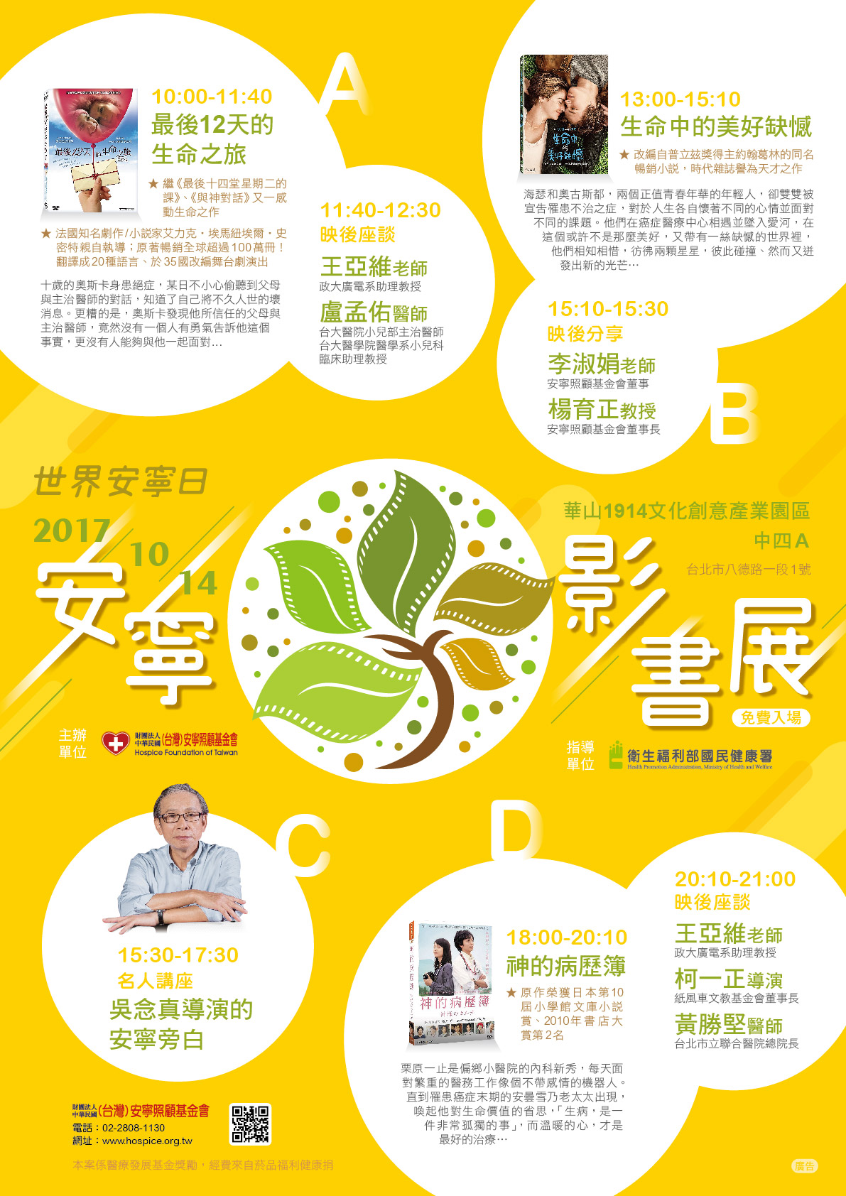 「安寧影/書展」當日將依序播映《最後12天的生命之旅》、《生命中的美好缺憾》及《神的病歷簿》三部國別、主題及拍攝手法完全不同的電影作品,於每場放映結束即舉辦座談,民眾可現場免費取票入場,來華山「看電影、學善終」。此外,台灣最會說故事的歐吉桑─吳念真導演,將於下午3:30出席影展現場開講,和大家談談近年來他看盡生離死別,所體會的生命無常與重量,歡迎大家來現場聽聽吳導的真情安寧告白。