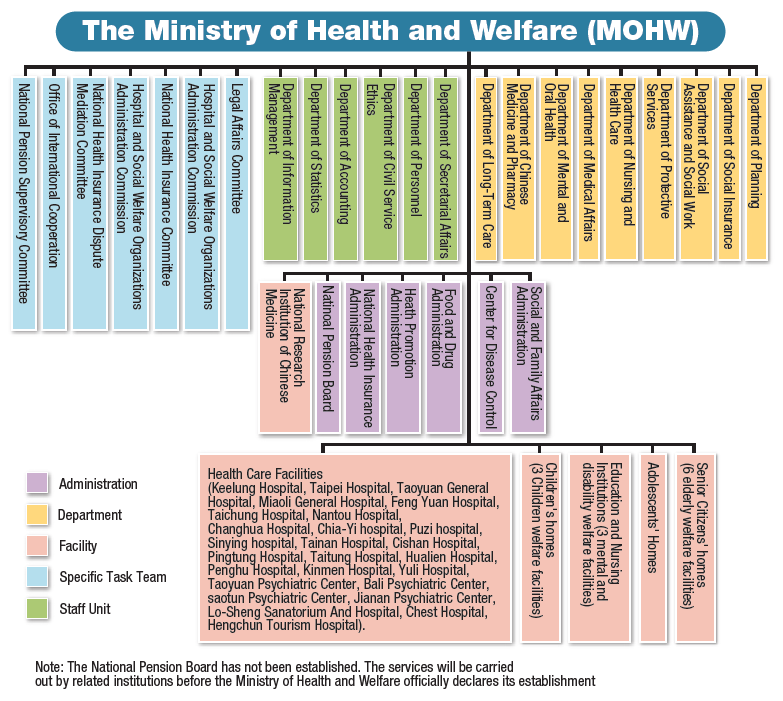 The Ministry of Health and Welfare was newly established in 2013. It included the former Executive Yuan's Department of Health and five sub-institutions: the Department of Social Affairs from the Ministry of Interior, the Children Bureau, the Committee for Prevention of Domestic Violence and Sexual Assault, the National Pension Supervisory Board, and the National Research Institution of TCM from the Department of Education. After reorganizing, the MOHW became a Ministry with 9 departments, 6 divisions, 6 level-three agencies (institutions), 26 ministerial hospitals, and 13 social welfare institutions (figure 1-1). The Department of Chinese Medicine and Pharmacy, the Department of Medical Affairs which administers Western medicine, and the Department of Mental and Oral Health which administers dentistry are among the 9 MOHW departments.