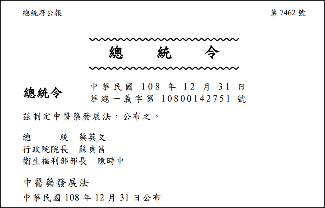 Figure 1-3: Presidential Office Gazette of Chinese Medicine and Pharmacy Development Act