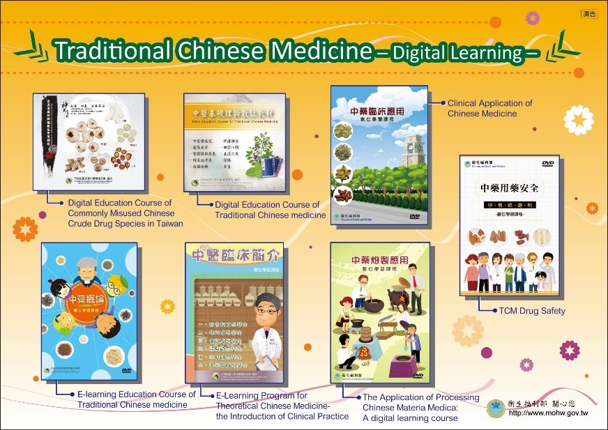 In order to boost TCM literacy and promote correct knowledge of TCM among the public, as well as foster proper habits of seeing TCM physicians and taking TCM products according to their directions, thus ensuring safe medicine use, the Ministry published 7 digital learning programs in 2011, totaling 50 hours, including: "Digital Education Course of Commonly Misused Chinese Crude Drug Species in Taiwan", "Digital Education Course of Traditional Chinese Medicine", "E-learning Education Course of Traditional Chinese Medicine", "E-learning Program for Theoretical Chinese Medicine: the Introduction of Clinical Practice", "Clinical Application of Chinese Medicine", "The Application of Processing Chinese Medicine Medica " and "TCM Drug Safety". The Ministry provides an interactive learning platform for public accessibility. The course contents have been placed on the “Chinese Medicine e-learning” website and “e-Learning Park + Learning Platform” (Figure 3-16), providing click-to-read.