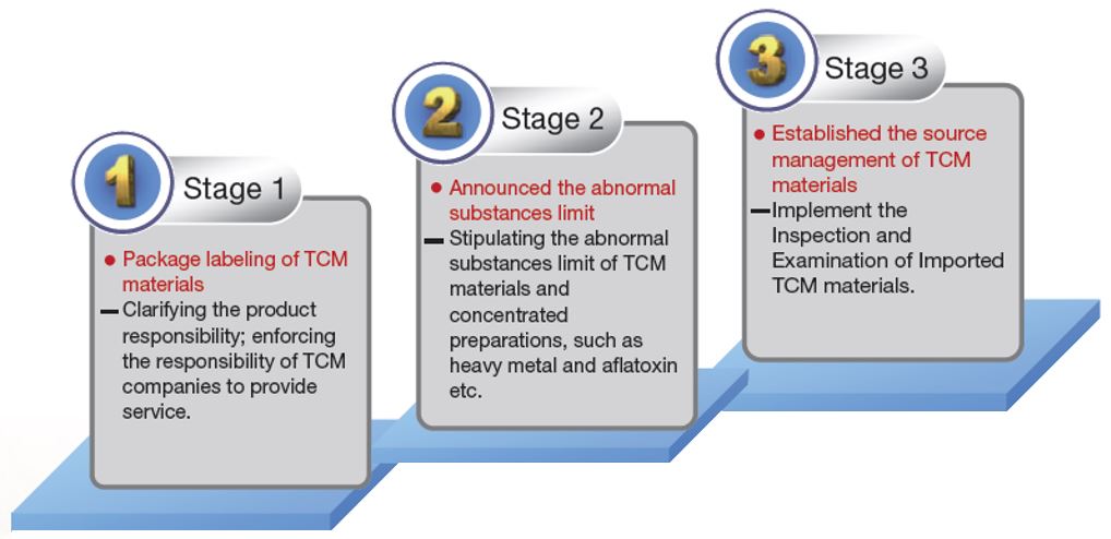 Since 26 October, 2006, TCM preparations are required to to be submitted to heavy metal or other abnormal substances examination. Later, starting 1 July, 2013, standard limits were set for abnormal substances in all TCM concentrated products. According to “The Standard Limits for Toxic Substances for TCM Preparations” announced on 26 October, 2006, standard limitations on heavy metals for 5 kinds of single ingredient products, Liquorice Root, Gypsum, Fossilia Ossis Mastodi, Ginseng Root and Myrrh were established. In addition, “The Standard Limits of Abnormal Substances and Scope of Application” for 22 kinds of TCM formula products, such as “Tian Wang Buxin Dan”, was established on 26 December, 2013. Starting 1 July, 2014, these 22 traditional product items must meet the standard limits for total heavy metals as well as individual limitations for lead, cadmium, mercury and arsenic.
