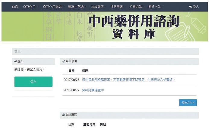 The Drug-Herb Interaction Database was officially posted online in 2017 (Figure 3-12), boasting a collection of 3,085 entries on drug-herb interaction research: 2,846 entries on drug-herb polypharmacy and pairing, and 475 entries on TCM literature and TCM incompatibility. The system is connected to the Taiwan Herbal Pharmacopeia Online Database and TCM License Inquiry System, to providing access for both clinicians and researchers. Moreover, it has been integrated with the Food and Drug Administration of the MOHW to form the"Drug Information Database" (https://mcp.fda.gov.tw/) (Figure 3-13). The platform's interface has been refined by augmenting separate search interfaces for the general public and medical professionals in order to cater to the specialized needs of different groups.