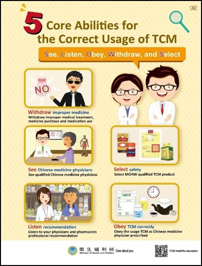 In order to enhance public awareness of TCM-related health education and build up concepts of correct TCM usage in daily life, in recent years the Ministry has engaged in the promotion of TCM health education. The five core abilities for correct usage of TCM are"Withdraw, See, Listen, Select, and Obey"which sums up the five key tips for correct TCM usage:"Withdraw improper medicines, See Chinese medicine physicians, Listen to recommendations, Select safety, and Obey TCM instructions correctly."We combined the strengths of TCM health education resource centers, TCM medical institutions, community primary clinics, and pharmacies to organize a series of health education and advocacy activities in settings such as communities, school campuses, and workplaces. We also produced various health education brochures, posters (Figures 3-15), and animation videos to convey messages via seminars and multi-media interaction, which will spread and disseminate the knowledge on TCM and raise TCM awareness and concepts in the general public.