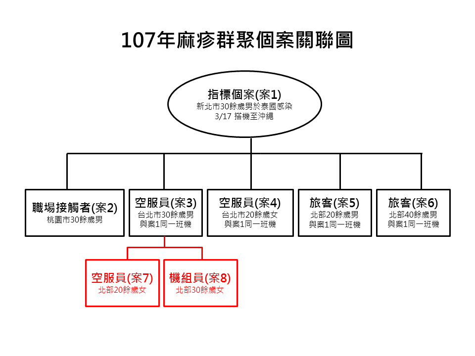疾管署表示,2名確診個案分別為北部20多歲女性(案7)及30多歲女性(案8),均為4月3日公布之北部30多歲男性確診個案(案3空服員)工作接觸者,分別於4月6日及8日接種麻疹、腮腺炎、德國麻疹混合疫苗(MMR),陸續於4月11日、12日出現疑似症狀,由衛生單位協助就醫、採檢通報,經疾管署檢驗、定序後於今(17)日確診。