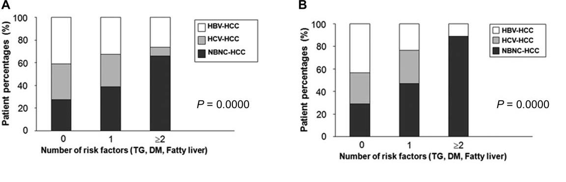 國家衛生研究院人體生物資料庫之「台灣肝癌網」,在民國105年發表自2005年至2011年收集的3,843例肝癌病患之肝炎病毒分析研究,這是英文文獻上最大數目之肝癌病人之肝炎病毒分析研究。其中有大約一成(411例)為沒有慢性病毒性肝炎感染之病患。由於數量大,十分難得,又有收集完整資料及血液檢體,所以我們得以進一步分析這411例檢測不到肝炎病毒的肝癌患者得癌的風險因子。我們挑選同時期且配對(同樣年紀同樣性別),但是有慢性B型或C型病毒性肝炎感染之肝癌病患各420例來和這411例作比較。研究結果顯示,無慢性病毒肝炎的肝癌患者,他們有三個代謝性疾病之風險因子顯著高於配對之慢性B型或C型病毒性肝炎感染之肝癌病患,這三個風險因子為: : (一)脂肪肝(由超音波檢測),(二) 糖尿病史,(三) 三酸甘油脂過高( triglyceride > 160 mg / dL)。