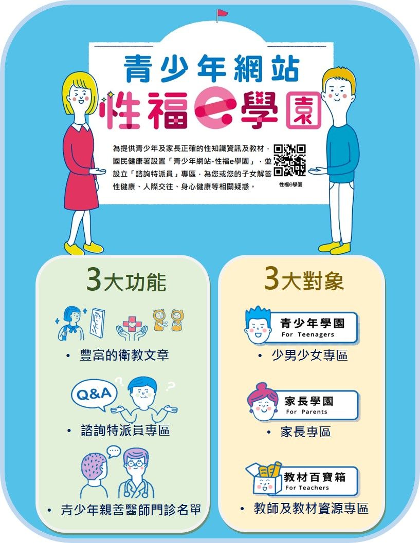 適逢暑假即將來臨,青春期少男少女若對於交往的界線拿捏不清,或性教育知識不足,容易發生沒有防護措施的性行為。此時家長的分享與陪伴,建立親子間談「性」的溝通橋樑,或有官方網站給予正確知識,也許就能避免憾事發生。國民健康署的「青少年網站-性福e學園」是提供家長與青少年孩子談「性」時的工具及資源,內容教導家長面對孩子青春期成長變化時的因應措施與心理調適等相關建議,包含各領域專家撰寫的性健康衛教文章與推薦教材,更有匿名的線上諮詢服務及相關轉介資源。期待家有青少年子女的爸爸或媽媽,能順利陪伴孩子面對青春期的困擾,並一同與孩子並肩成長。