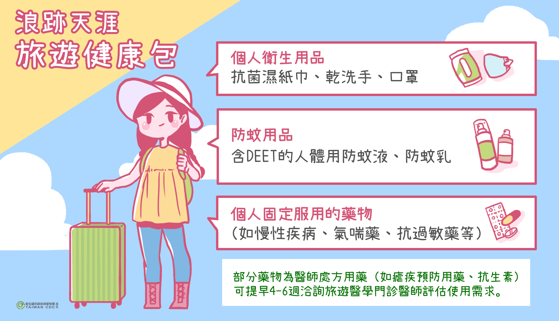 每年暑假為民眾出國旅遊高峰期,但旅程中充滿了不確定的疾病風險,疾病管制署與臺灣屈臣氏個人用品商店股份有限公司合作,於今(6)日舉辦「旅遊要防疫,健康好容易」記者會。疾管署周志浩署長與屈臣氏商品管銷部賴鎰隆處長特地以出遊裝扮現身,呼籲有規劃出國旅遊的民眾可以準備旅遊防疫包,裡面可放置防蚊液、乾洗手液、口罩等防疫用品以備不時之需,並謹記「旅遊防疫三部曲」,包括旅行前、中、後注意事項,才能快樂出門,平安返家。