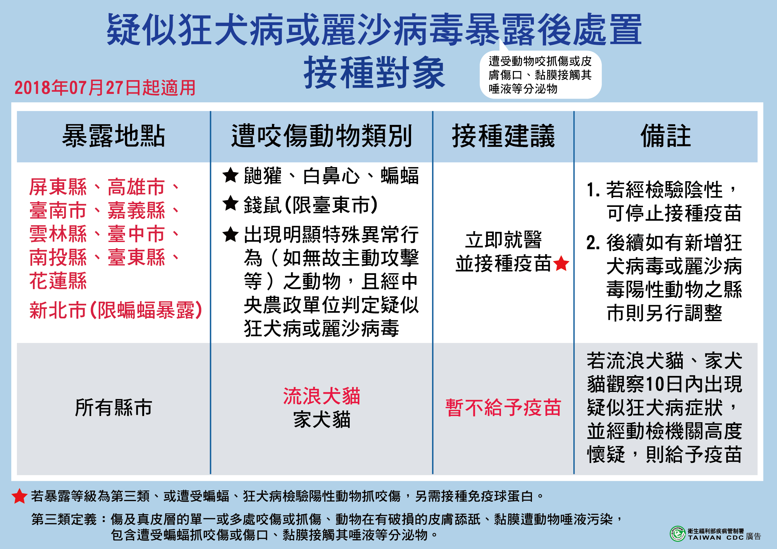 (三) 暴露地點以發生動物疫情之9縣巿為限,另農委會7月25日公布1例於新北市新店區發現蝙蝠感染新型麗沙病毒,增加新北市僅限蝙蝠暴露者,而後續如有新增狂犬病毒或麗沙病毒陽性動物之縣巿則另因應調整。